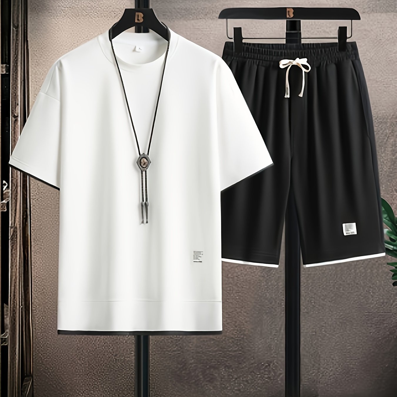 Men's Summer Casual Outfit T-Shirt and Shorts Set Crew Neck Patchwork Breathable Fabric