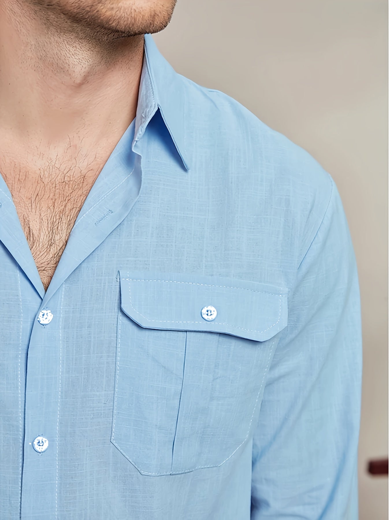 Men's Cotton Linen Blend Shirt Long Sleeve Lapel Collar Pockets Regular Fit Spring Fall