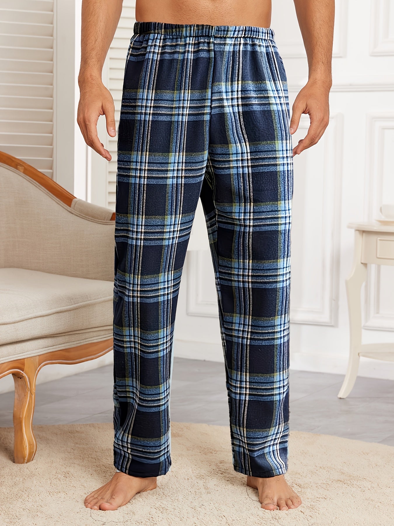 Men's Plaid Lounge Pants Fall Winter Polyester Blend Elastic Waist Casual Sleepwear Blue and White