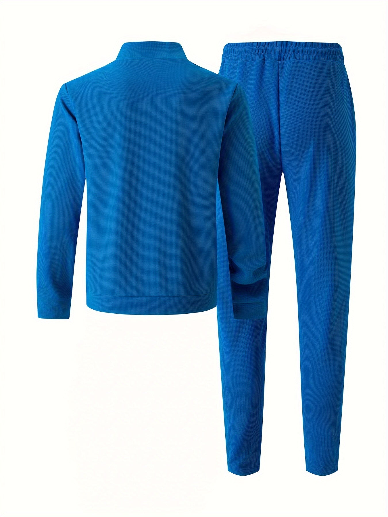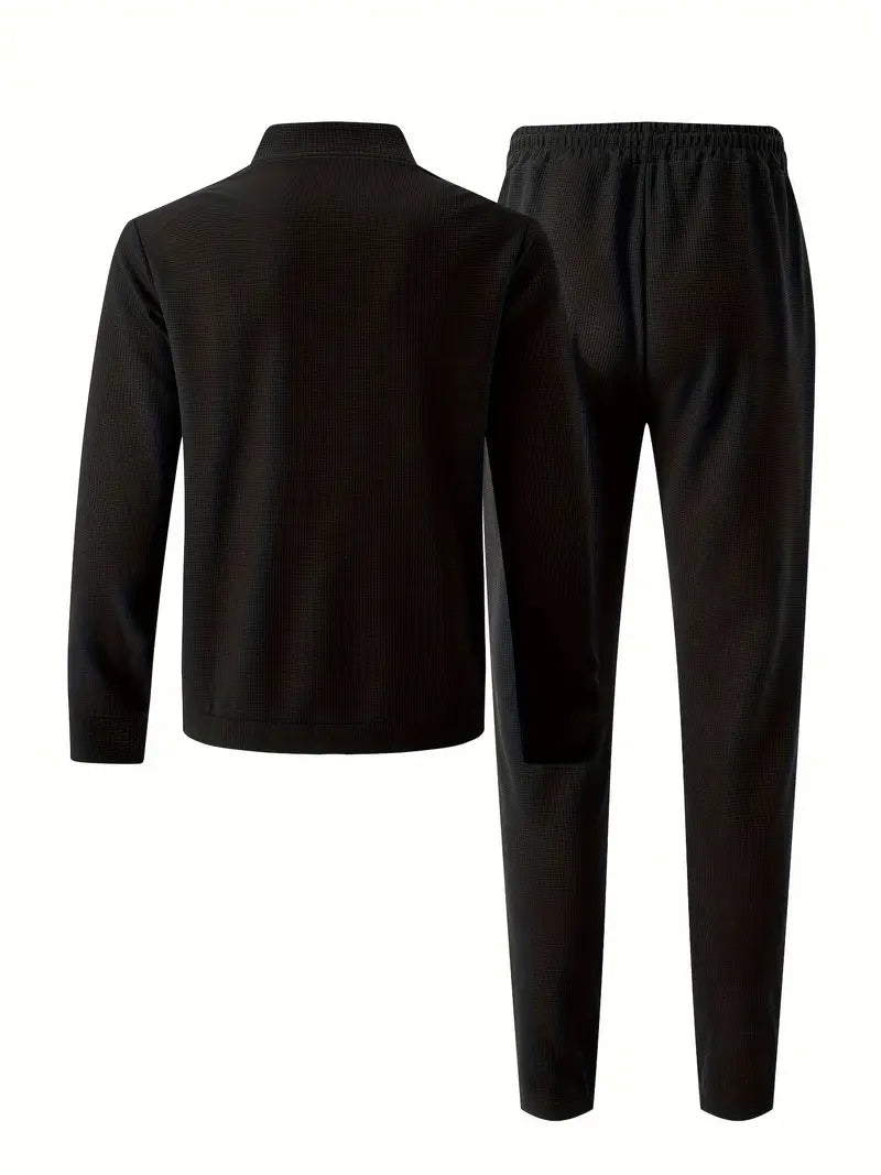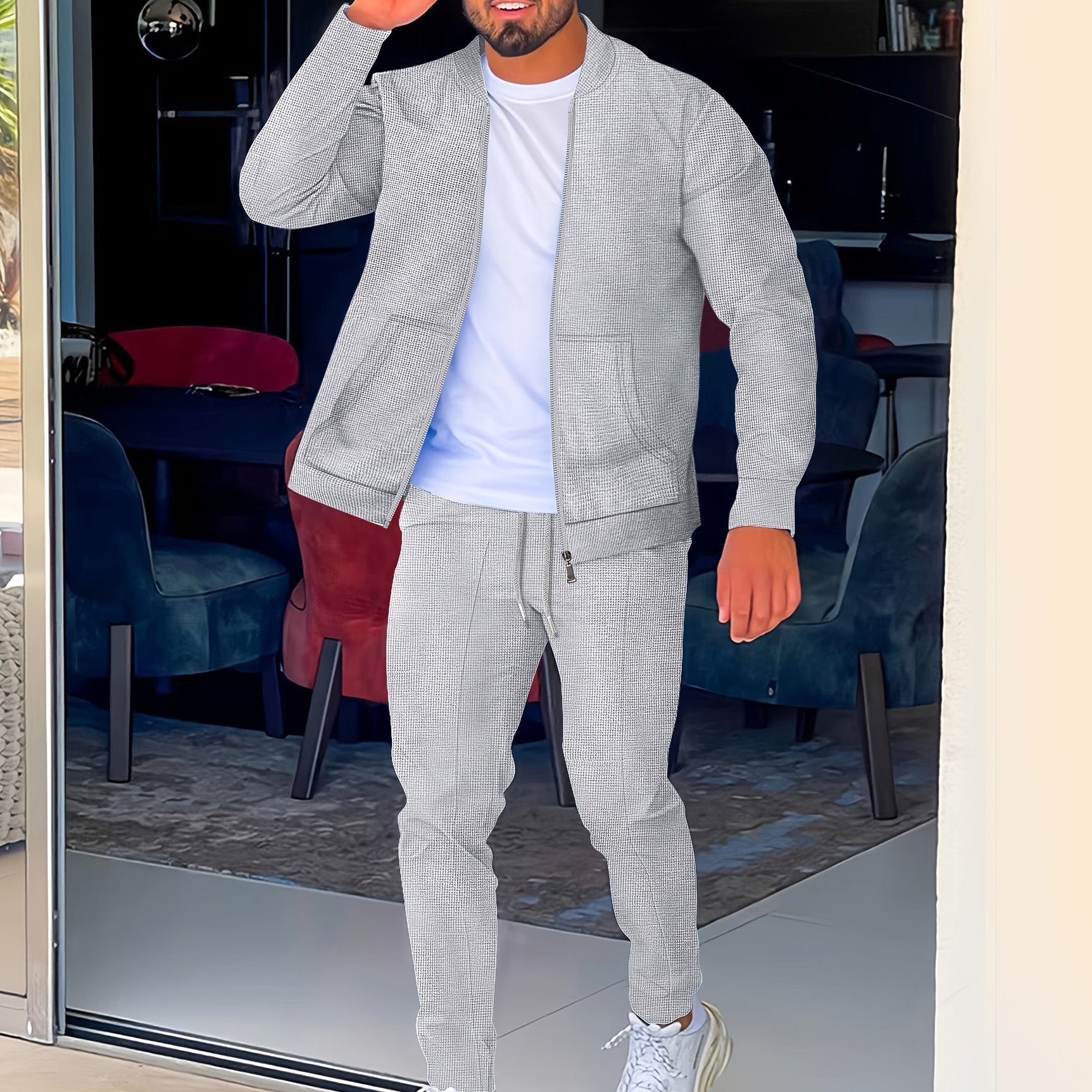 Men's Grey Waffle Knit Baseball Collar Sports Set Zip-Up Pants with Drawstring Waist