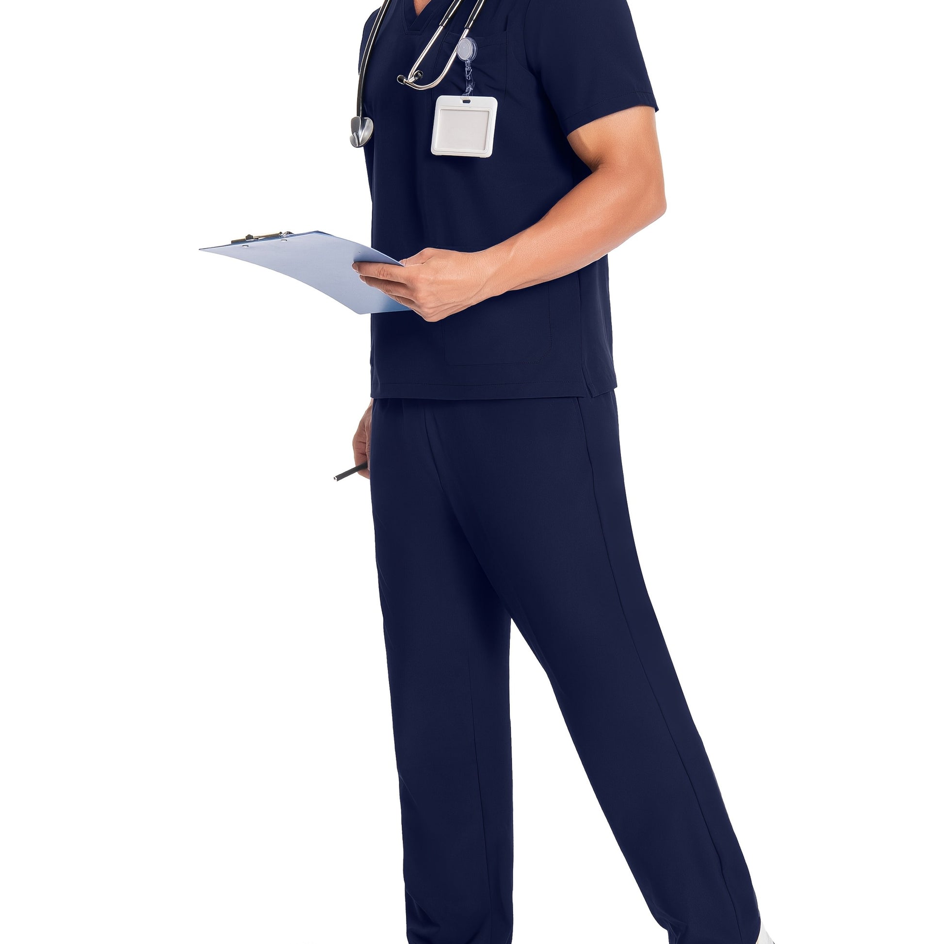 Men's Breathable Polyester Workwear Set V-Neck Top and Pants with Pockets for Pet Grooming and Lab Coats