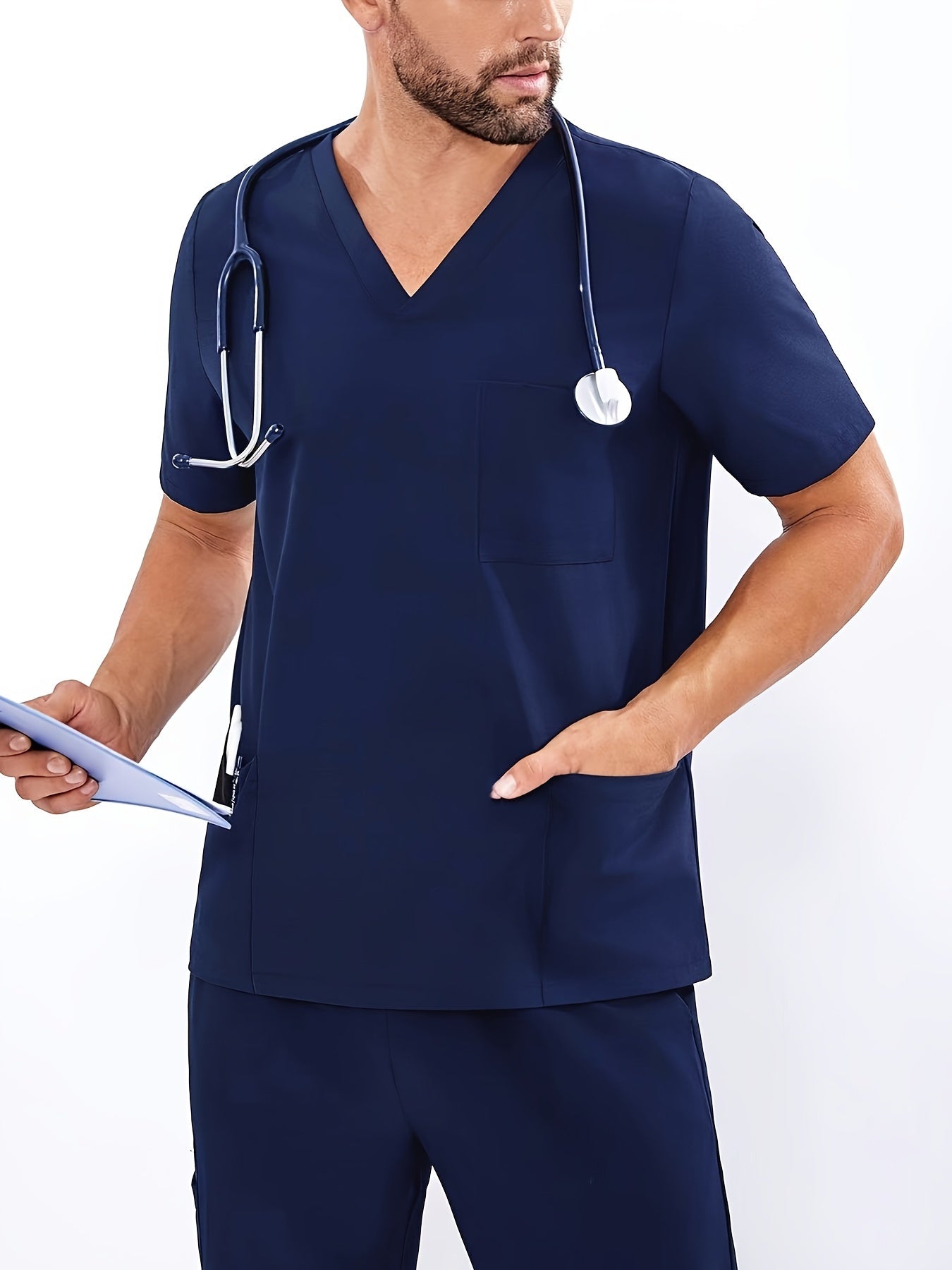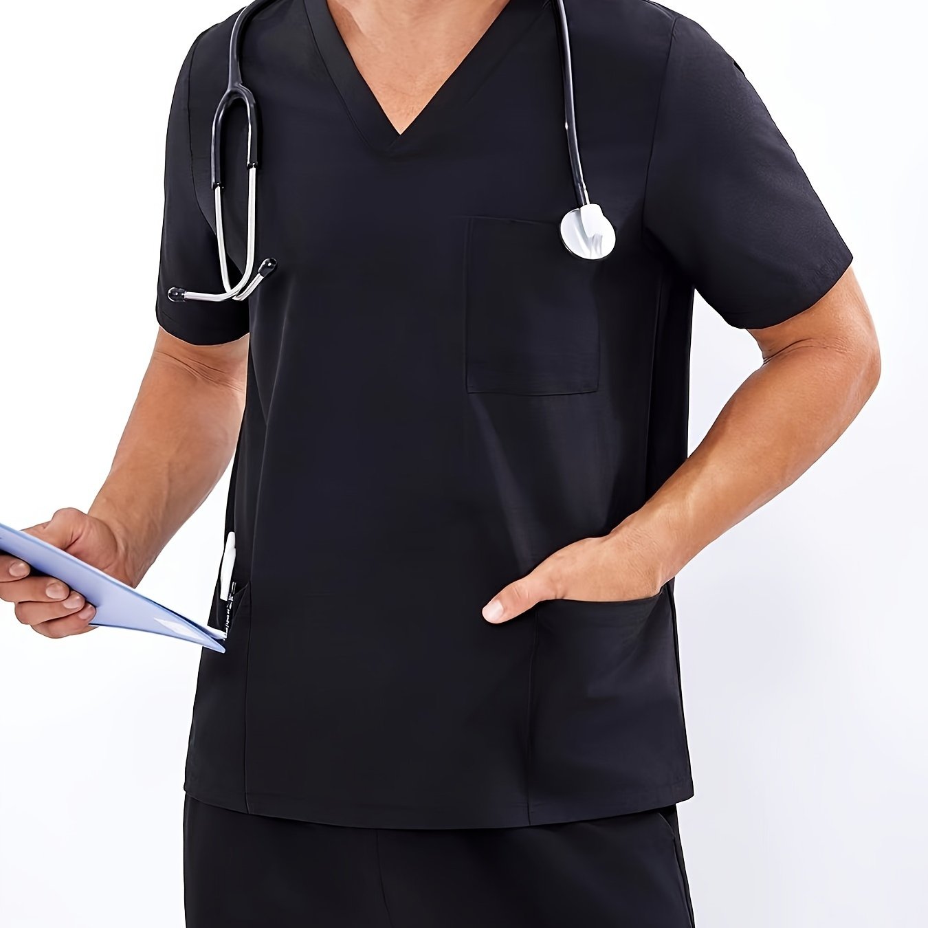 Men's Summer V-Neck Workwear Set Short Sleeve Shirt Pants Polyester Solid