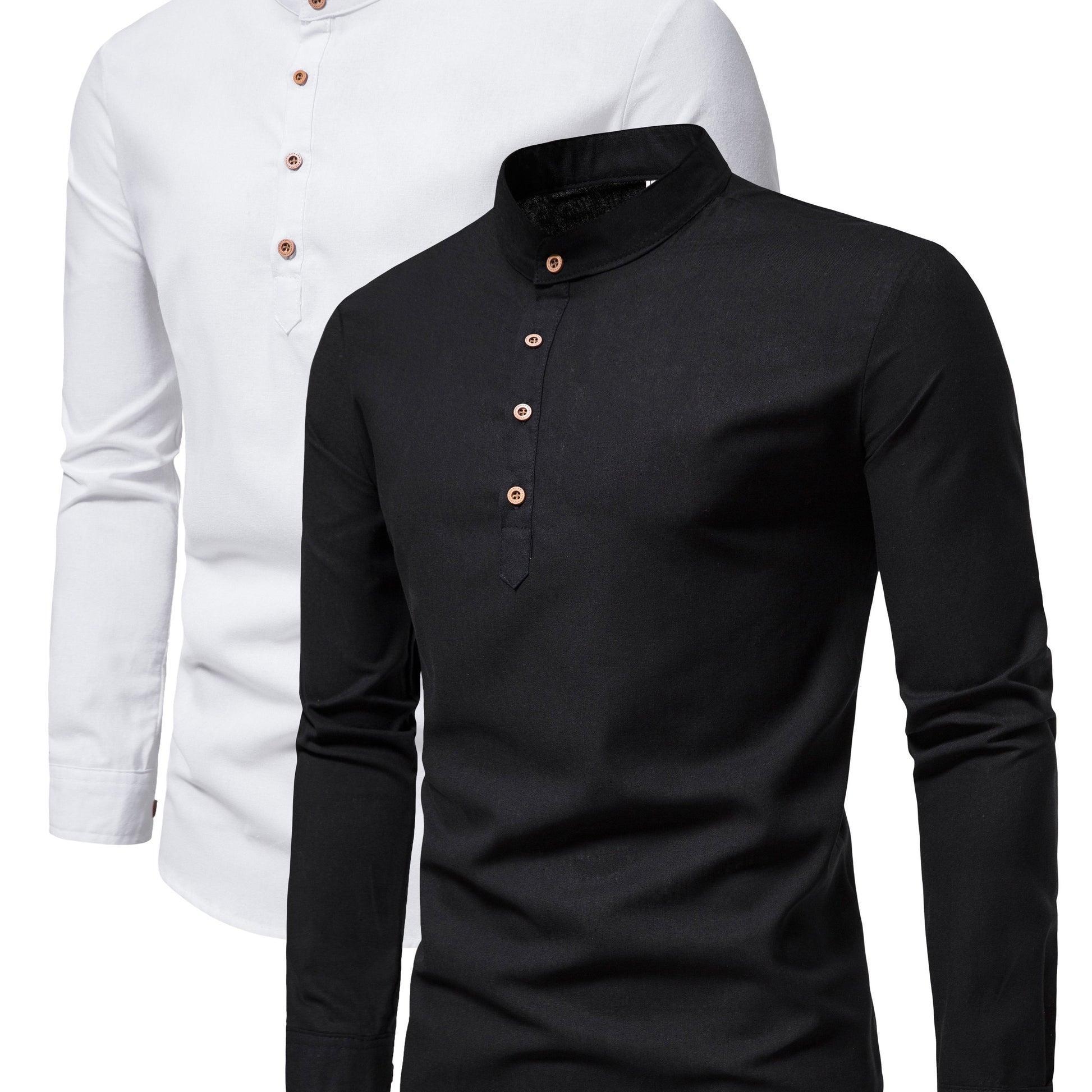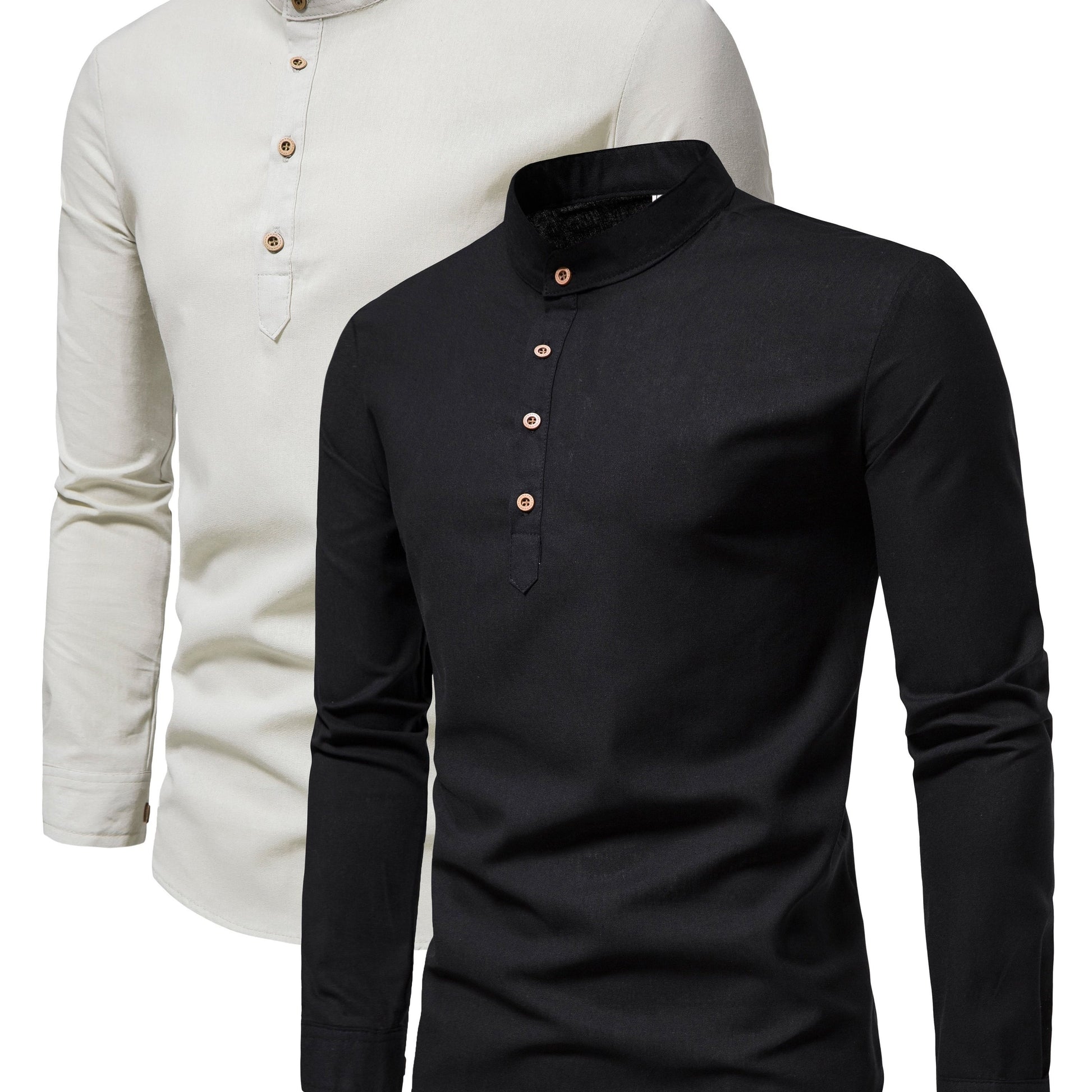 Men's Cotton Long-Sleeve Shirt Set Spring Autumn Stand Collar Slim Fit Solid Color Outdoor