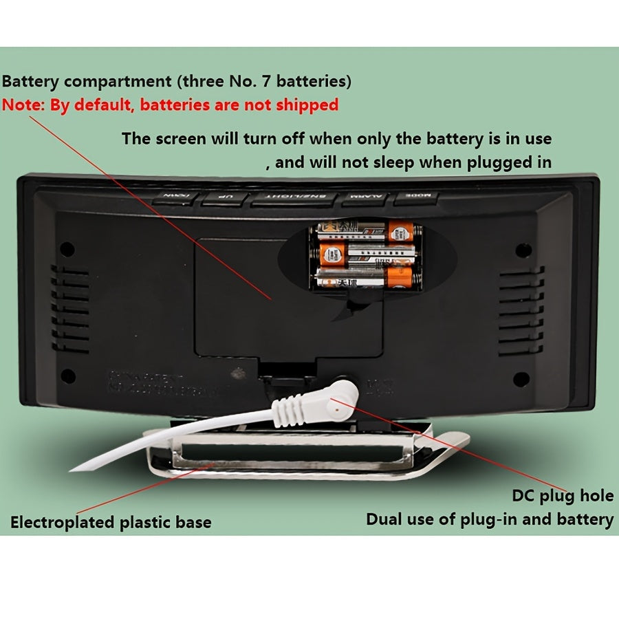 Black LED Curved Alarm Clock with Temperature Humidity Display and USB Battery Power