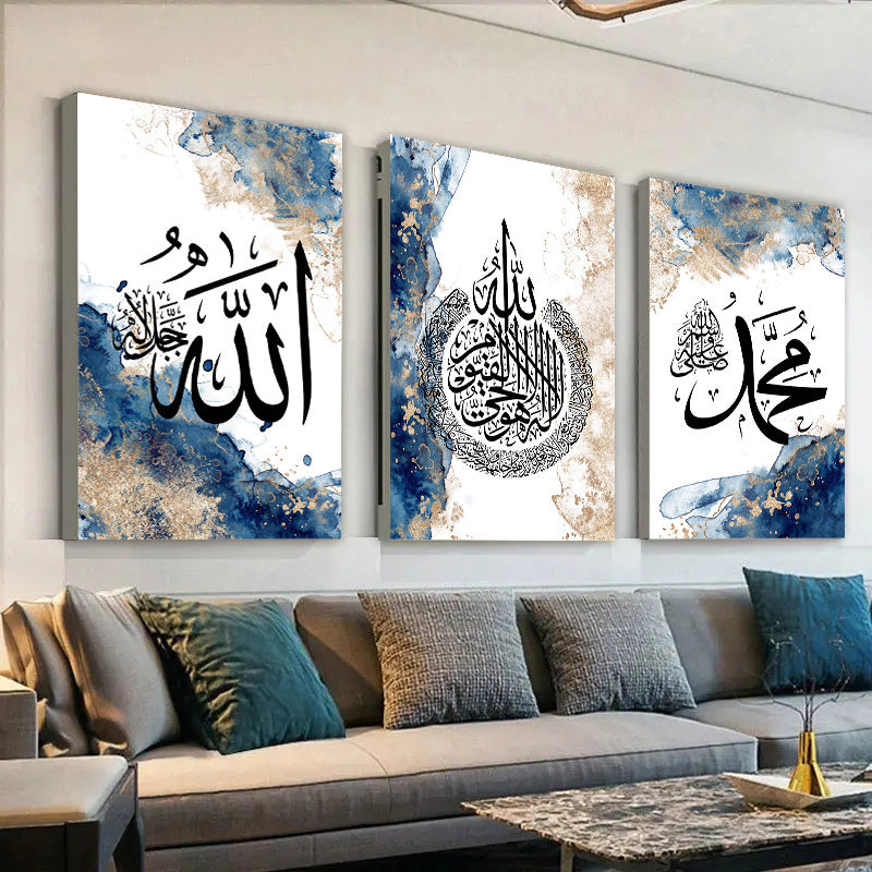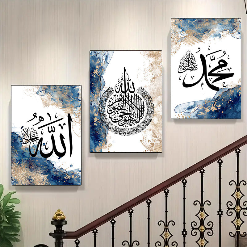 Modern Islamic Calligraphy Canvas Wall Art Set with Blue Marble Ayat Ul Kursi Posters