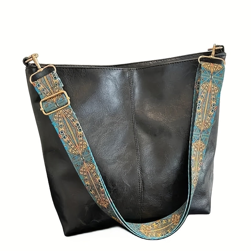 Ethnic Style Wide Band Vintage PU Shoulder Bag Large Capacity Tote for Commuter