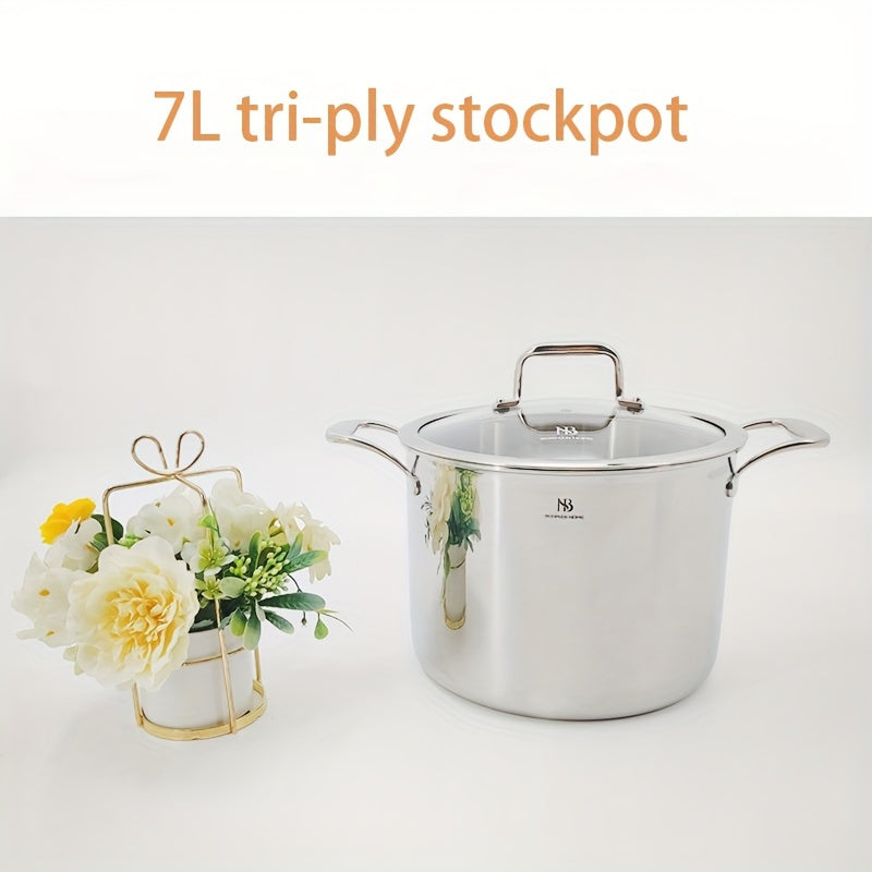 7L Stainless Steel Stockpot with Glass Lid, Deep Cooking Pot for Gas Induction Electric Stovetops