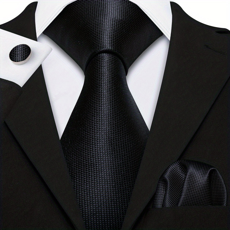 Perfect Gift: Matching Black Plaid Jacquard Tie, Cufflinks, and Pocket Square Towel Set for Parties, Weddings, and Proms