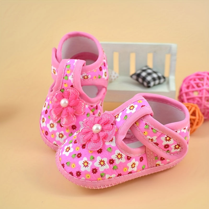 Pink Floral Baby Shoes for 0-1 Year Olds Lightweight Fabric Sequin Flowers Adjustable Strap