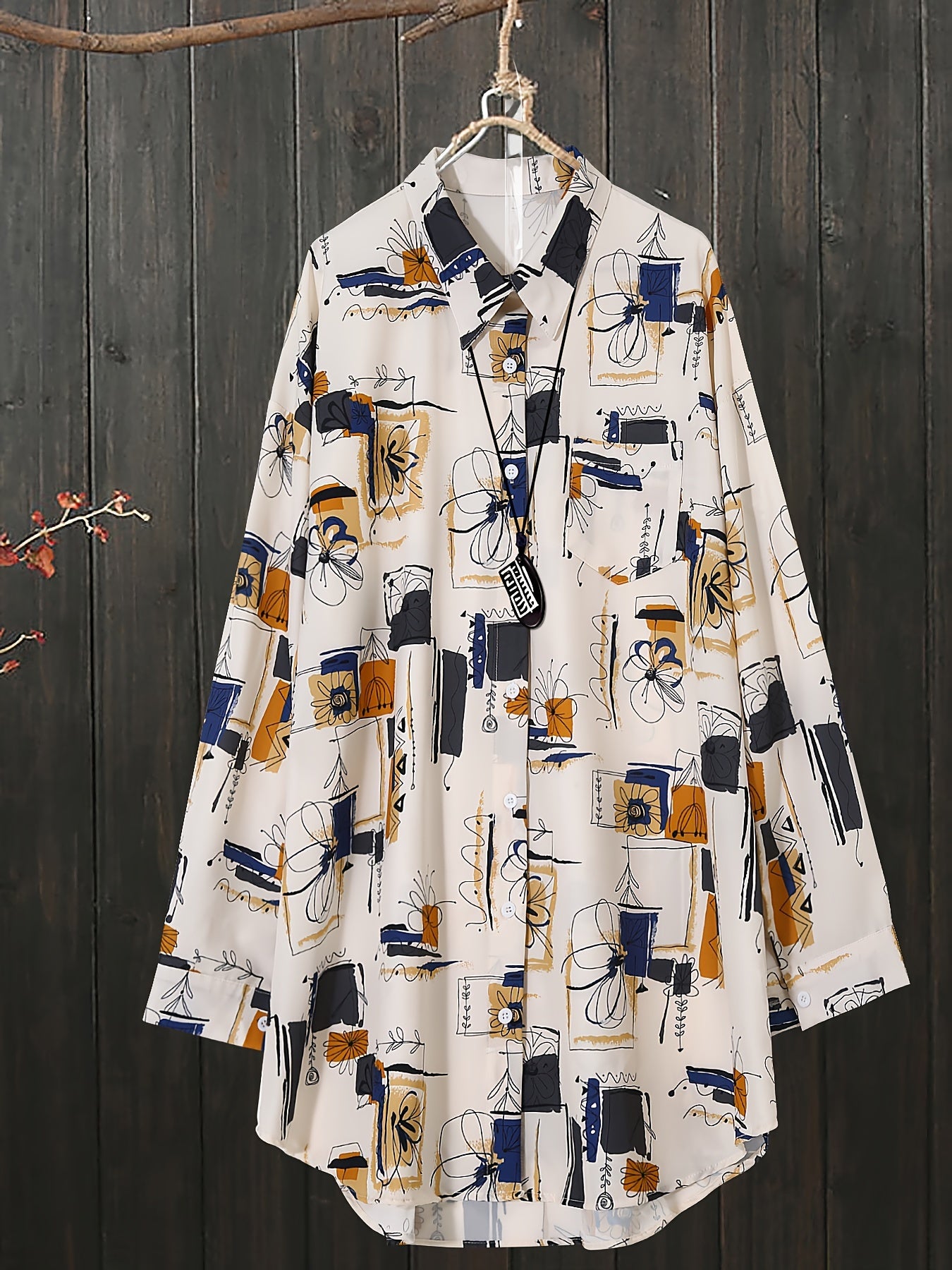 Plus Size Floral Print Long Sleeve Shirt Woven Fabric Asymmetrical Hem