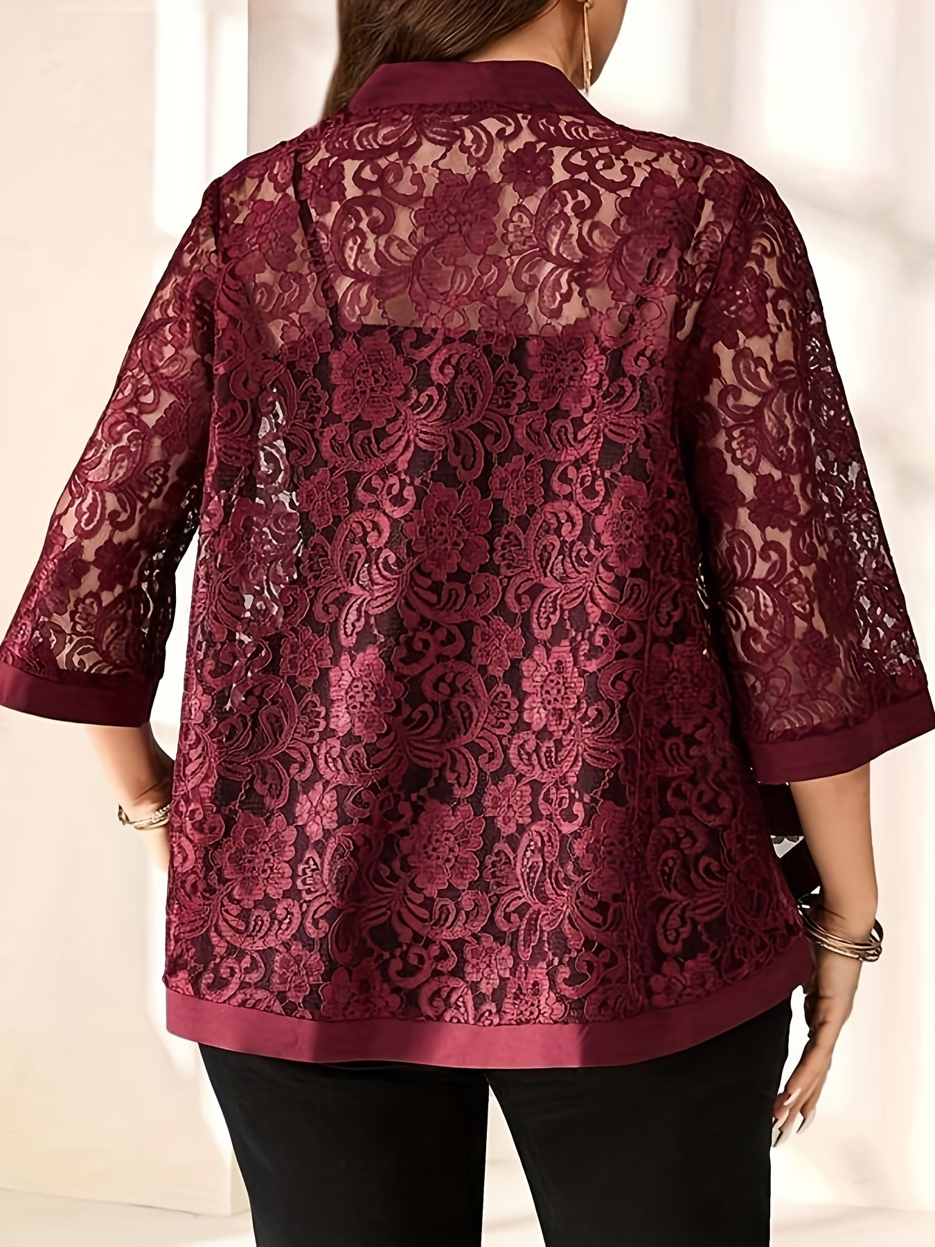 Plus Size Lace Cardigan Lightweight Semi-Transparent Three-Quarter Sleeve Black Summer Top