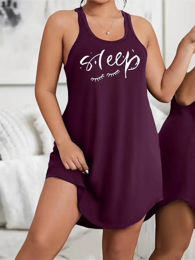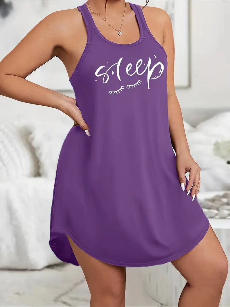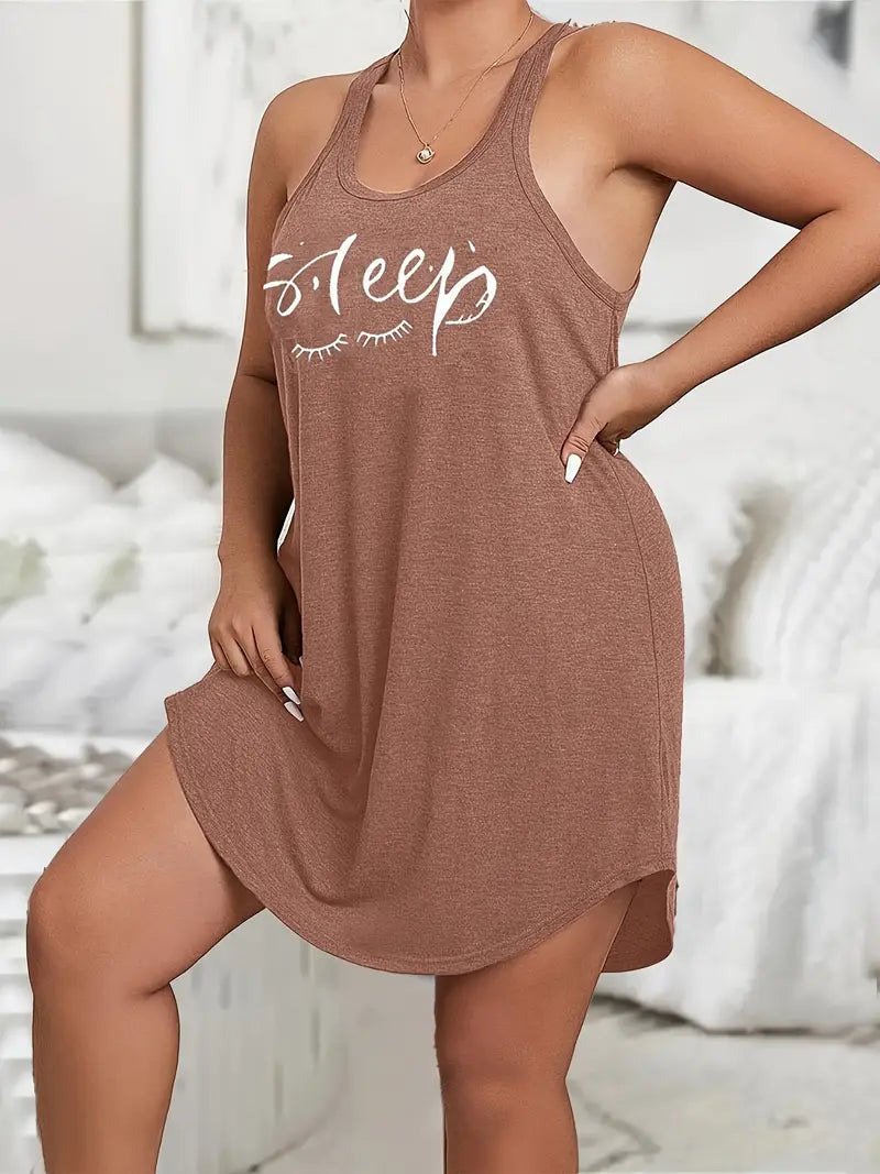 Plus Size Loungewear Dress with Scoop Neck Racer Back Eyelash and Letter Print
