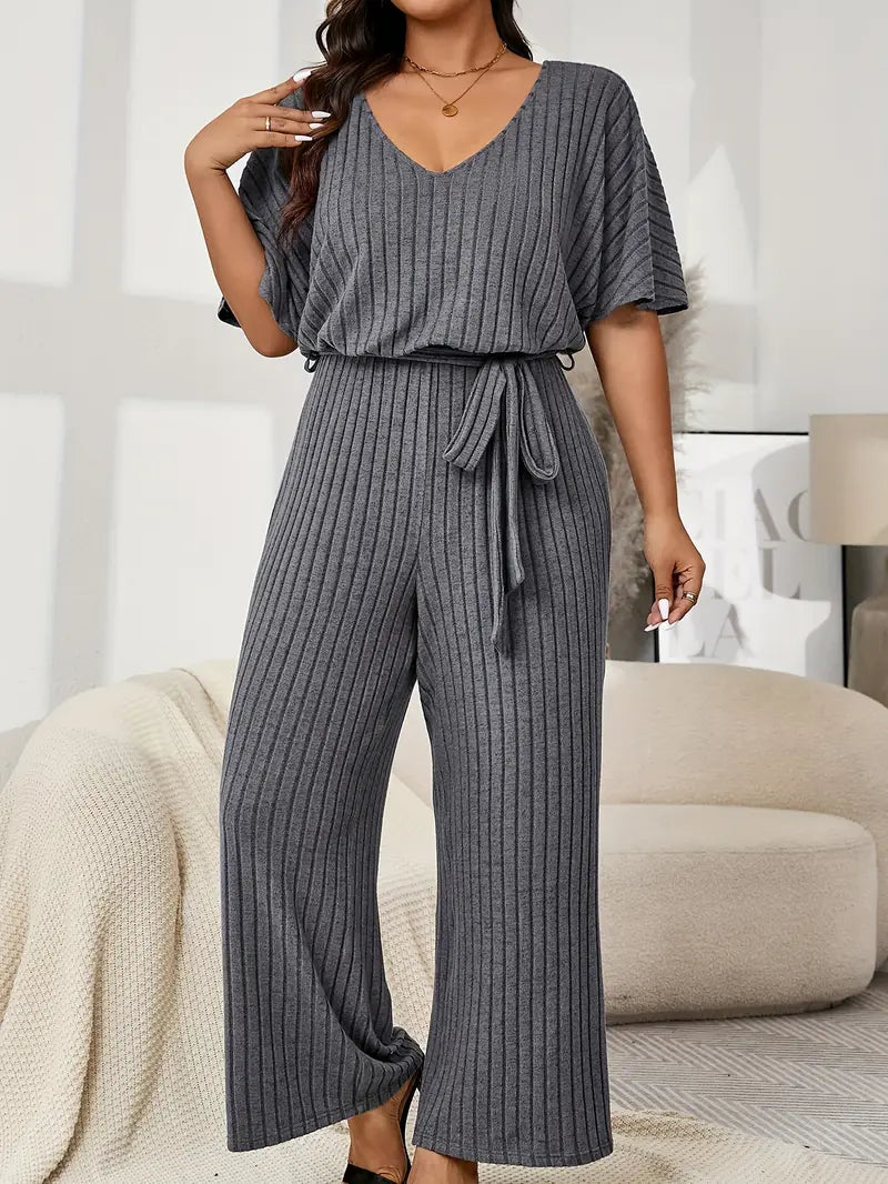 Plus Size Ribbed Wide Leg Jumpsuit Casual Belted Short Sleeve V Neck