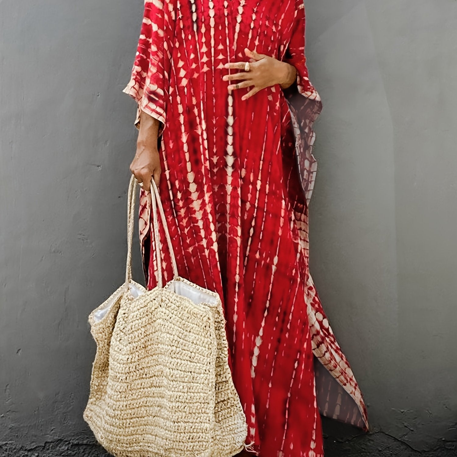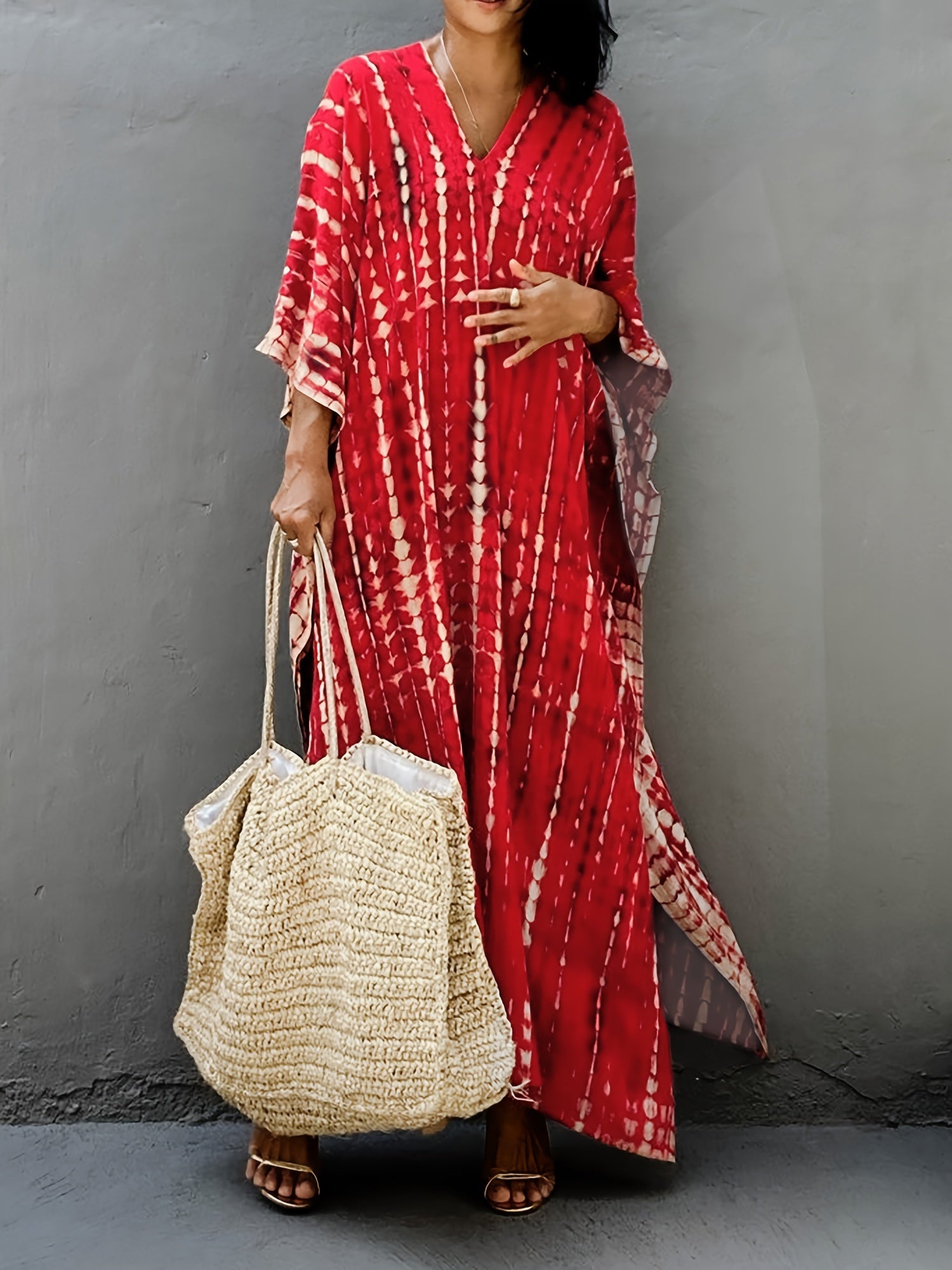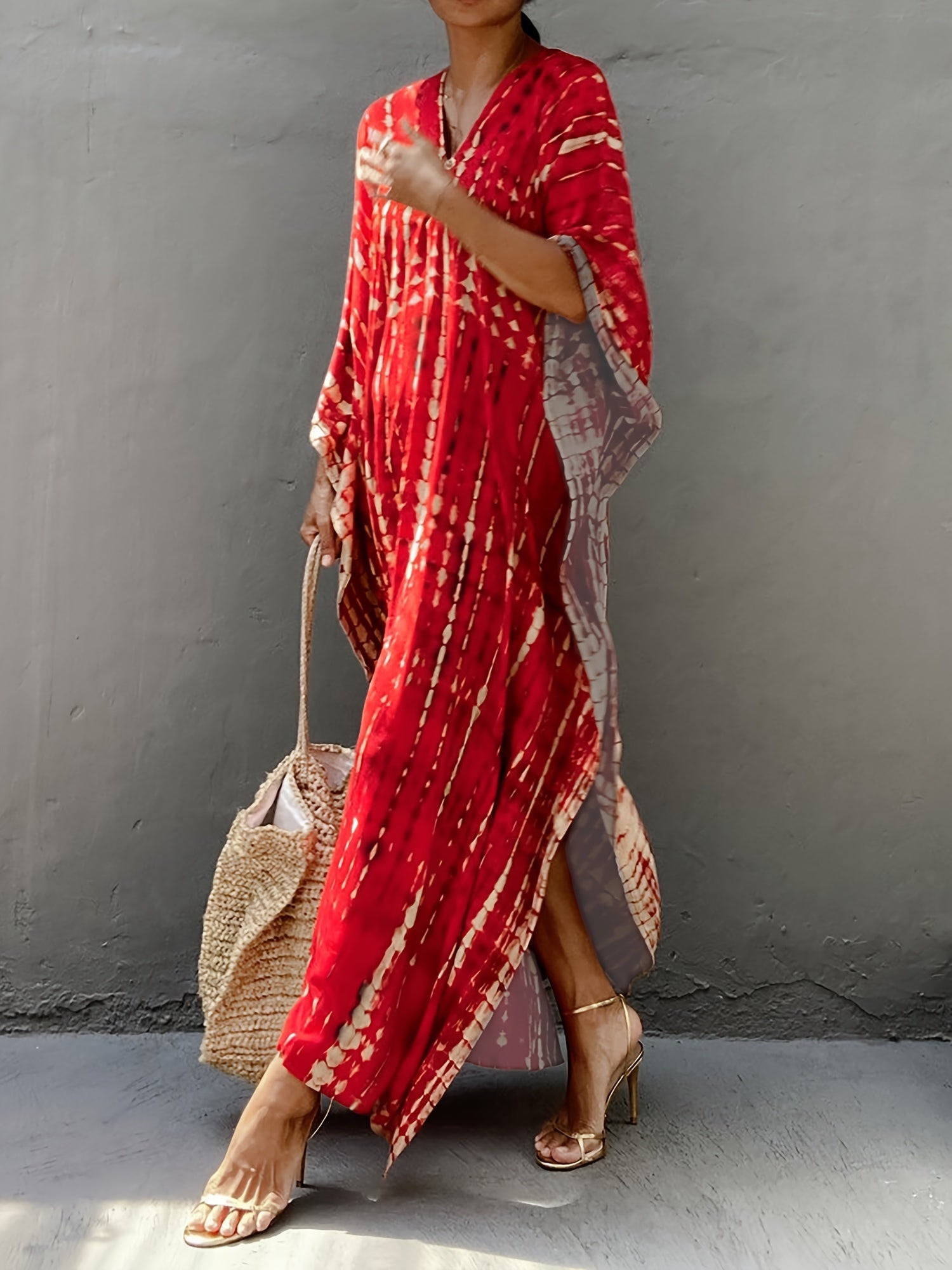 Plus Size Tie Dye Print Kaftan Dress Women V Neck Side Split Clothing