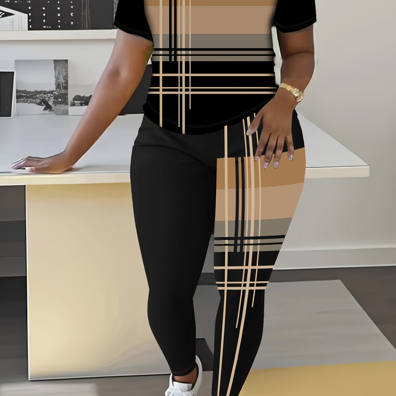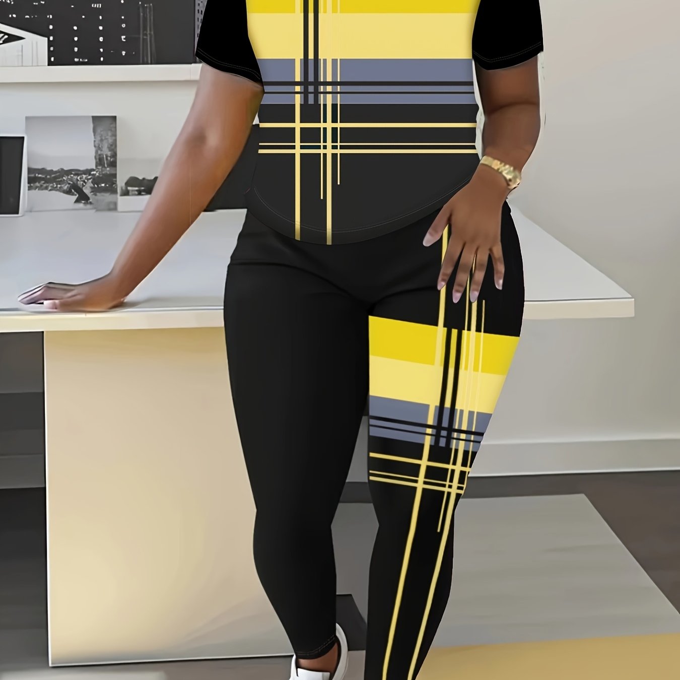 Plus Size Women's Activewear Set with Pink Geometric Print Polyester Yoga Outfit