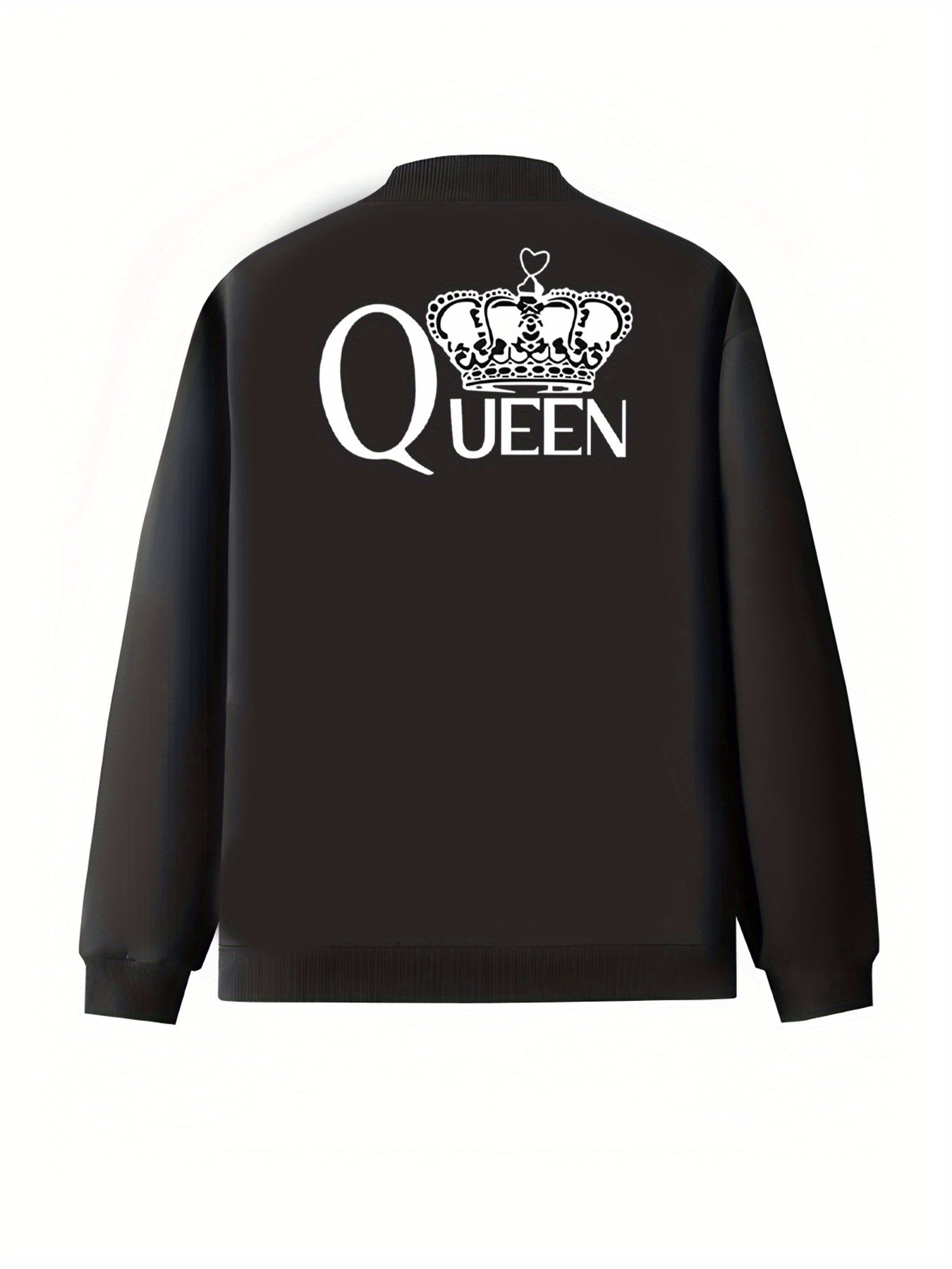 Plus Size Women's Black Casual Zip-Up Jacket with Crown Print Long Sleeve