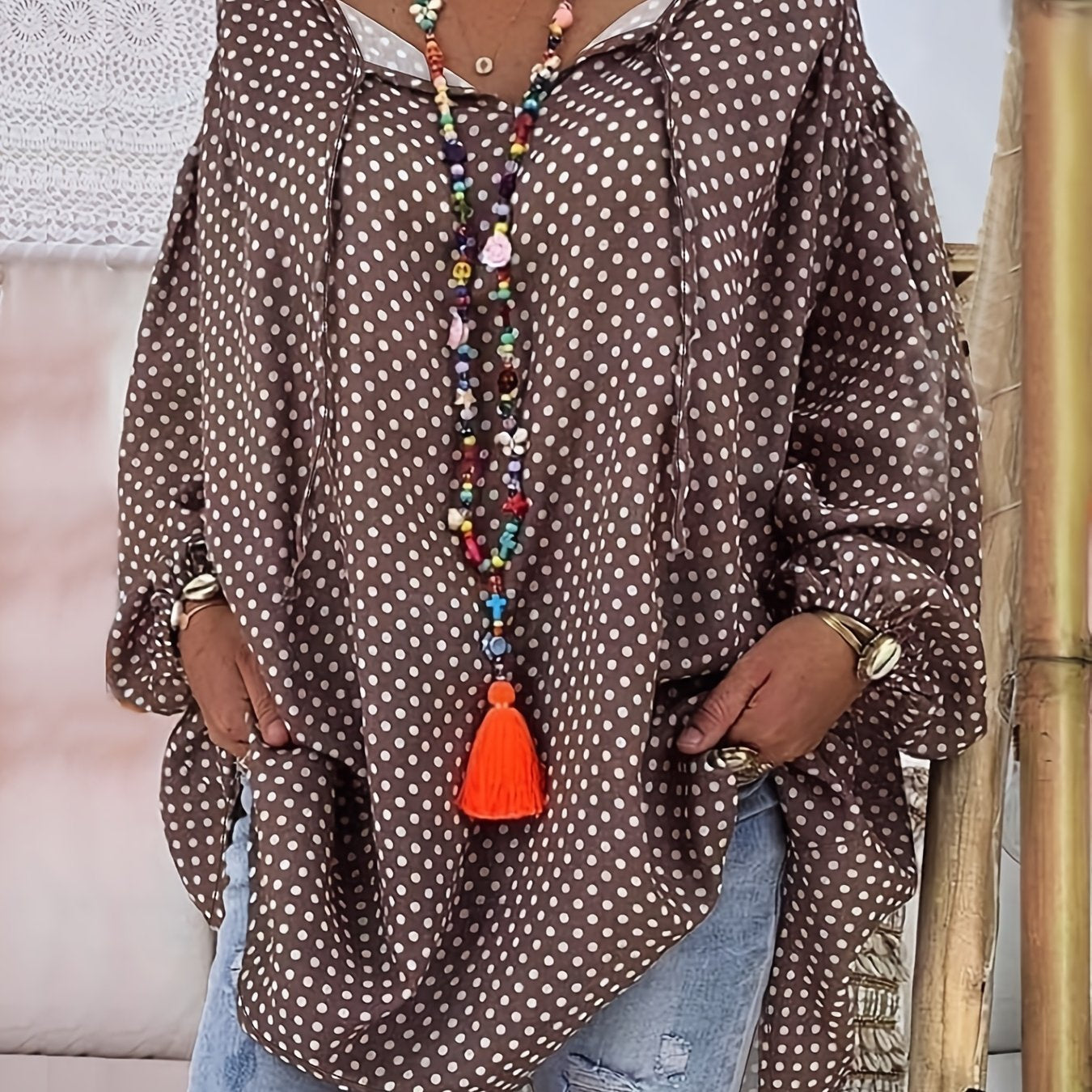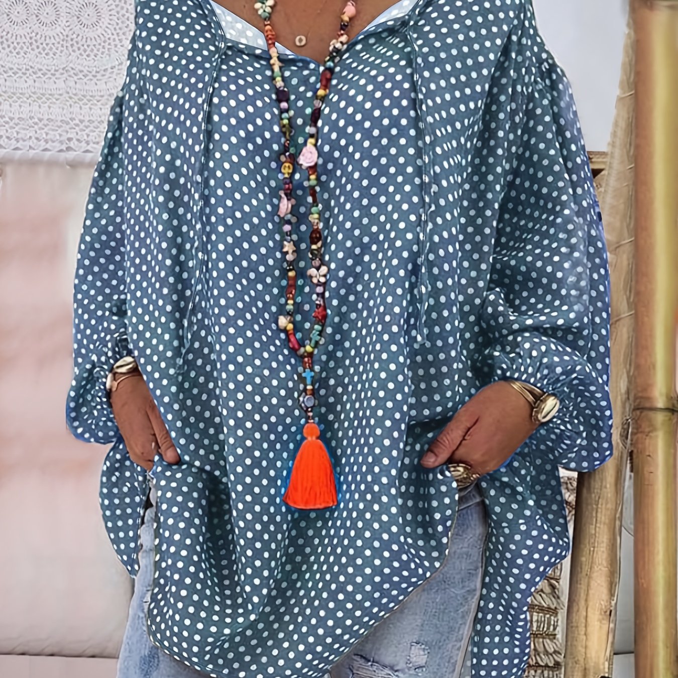 Plus Size Women's Casual V-Neck Tie Front Blouse Blue White Polka Dots