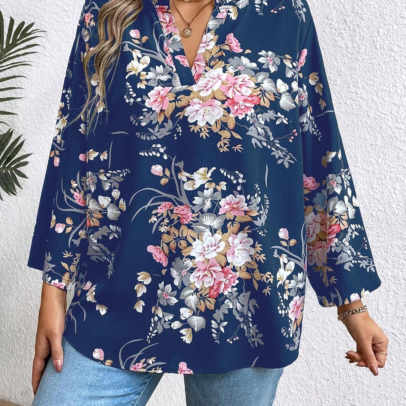 Plus Size Women's Floral Print V-Neck Blouse Lightweight Polyester Long Sleeve Top
