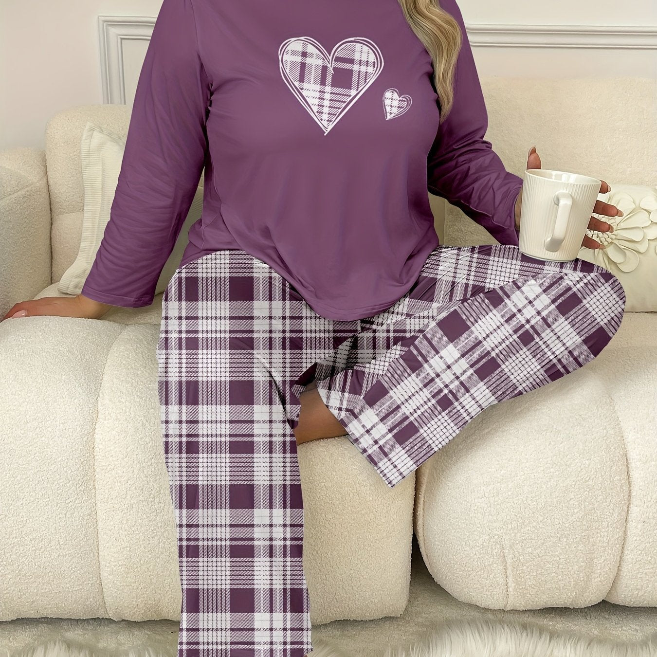 Plus Size Women's Pajama Set Heart Print Long Sleeve Top Plaid Pants Loungewear