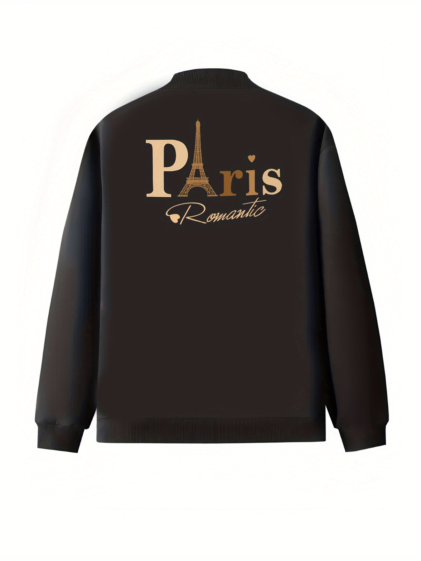 Plus Size Women's Paris Print Baseball Collar Jacket Lightweight Polyester Zip Jacket with Pockets