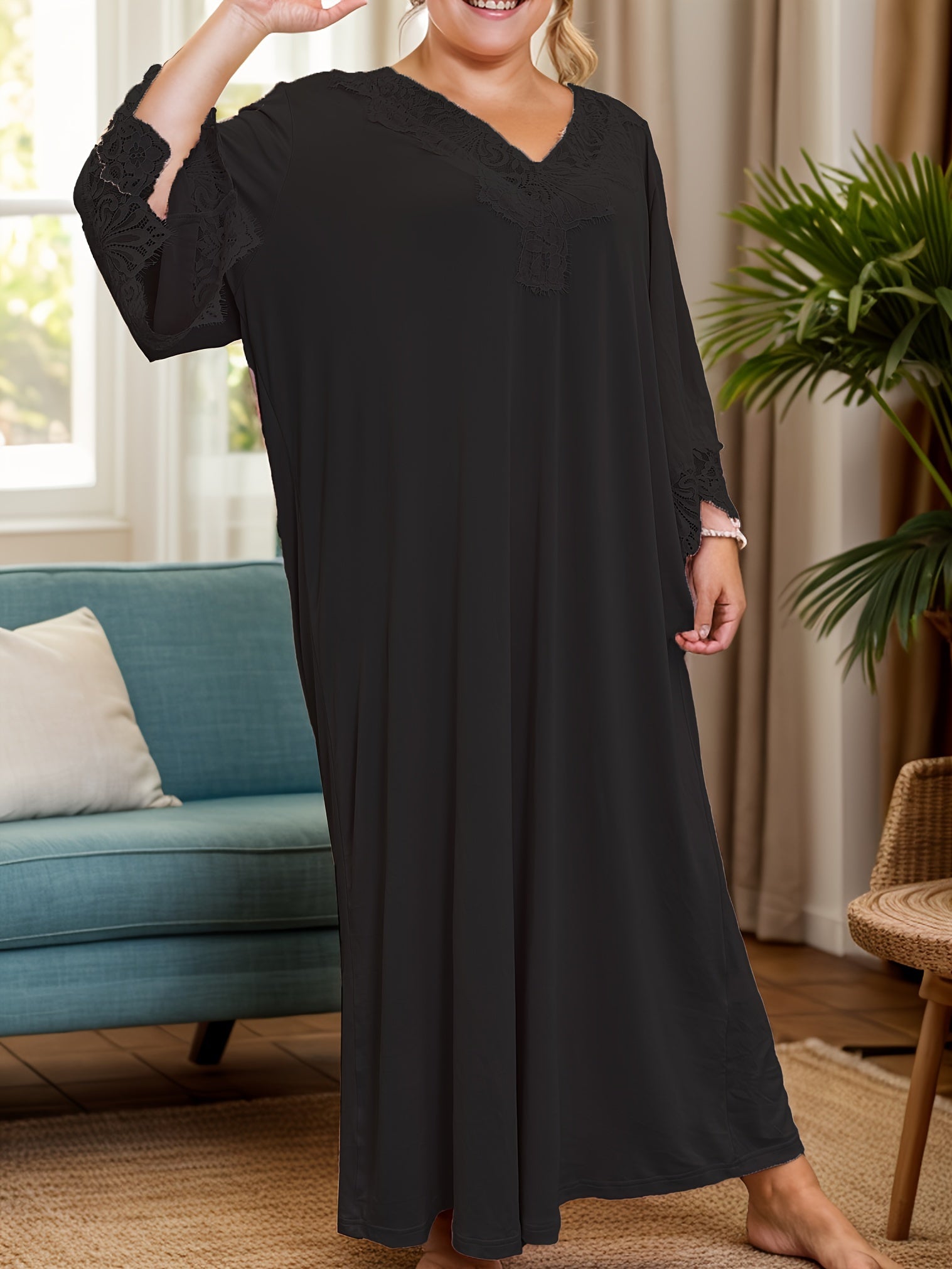 Plus Size Women's Satin Nightgown With Contrast Lace Cap Sleeve