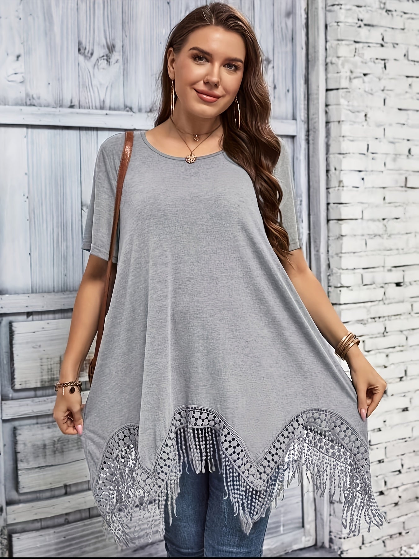 Plus Size Women's Short Sleeve T-Shirt with Fringe Hem Black Relaxed Fit