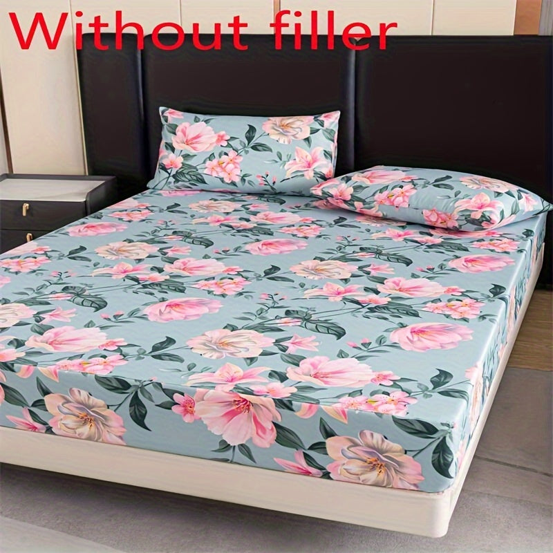 Printed Polyester Fitted Sheet Set with 2 Pillowcases Floral Pattern Bed Covering