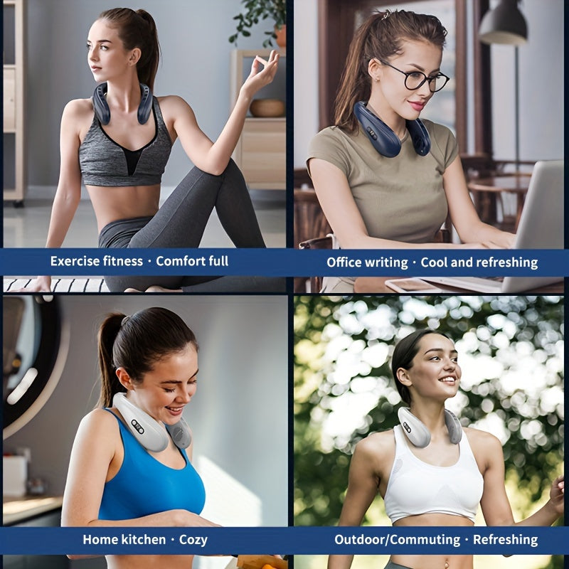 The Portable USB Rechargeable Neck Fan provides 360° full-body cooling with a powerful 5200mAh battery. It features adjustable airflow and a compact design, making it perfect for outdoor activities and travel.