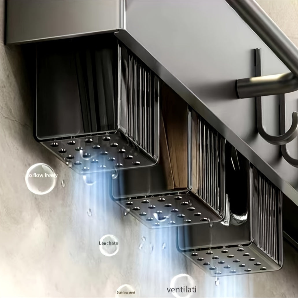 Carbon Steel Wall-Mounted Utensil Holder with Towel Bar and Drain Basket