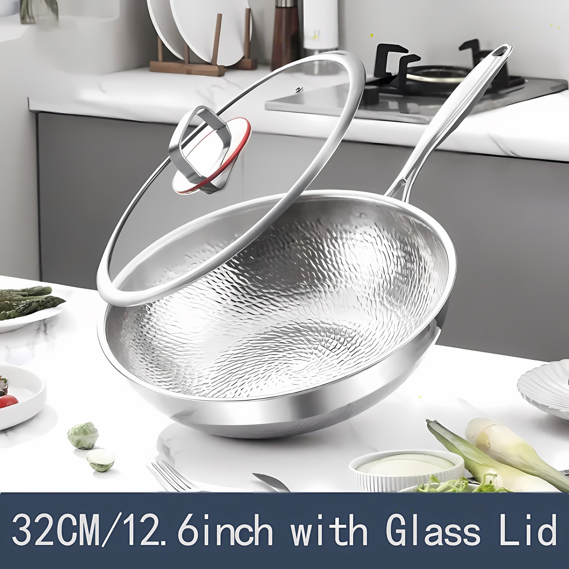 Titanium-Coated Wok with Lid 33cm Hammered Tri-Ply Stainless Steel Dishwasher Safe