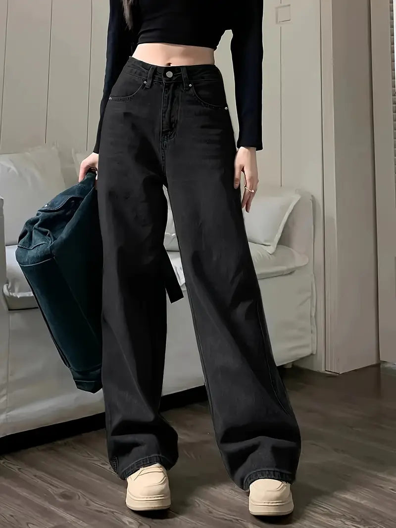 Women's Wide Leg Jeans with Slant Pockets Vintage Denim Pants Casual Streetwear