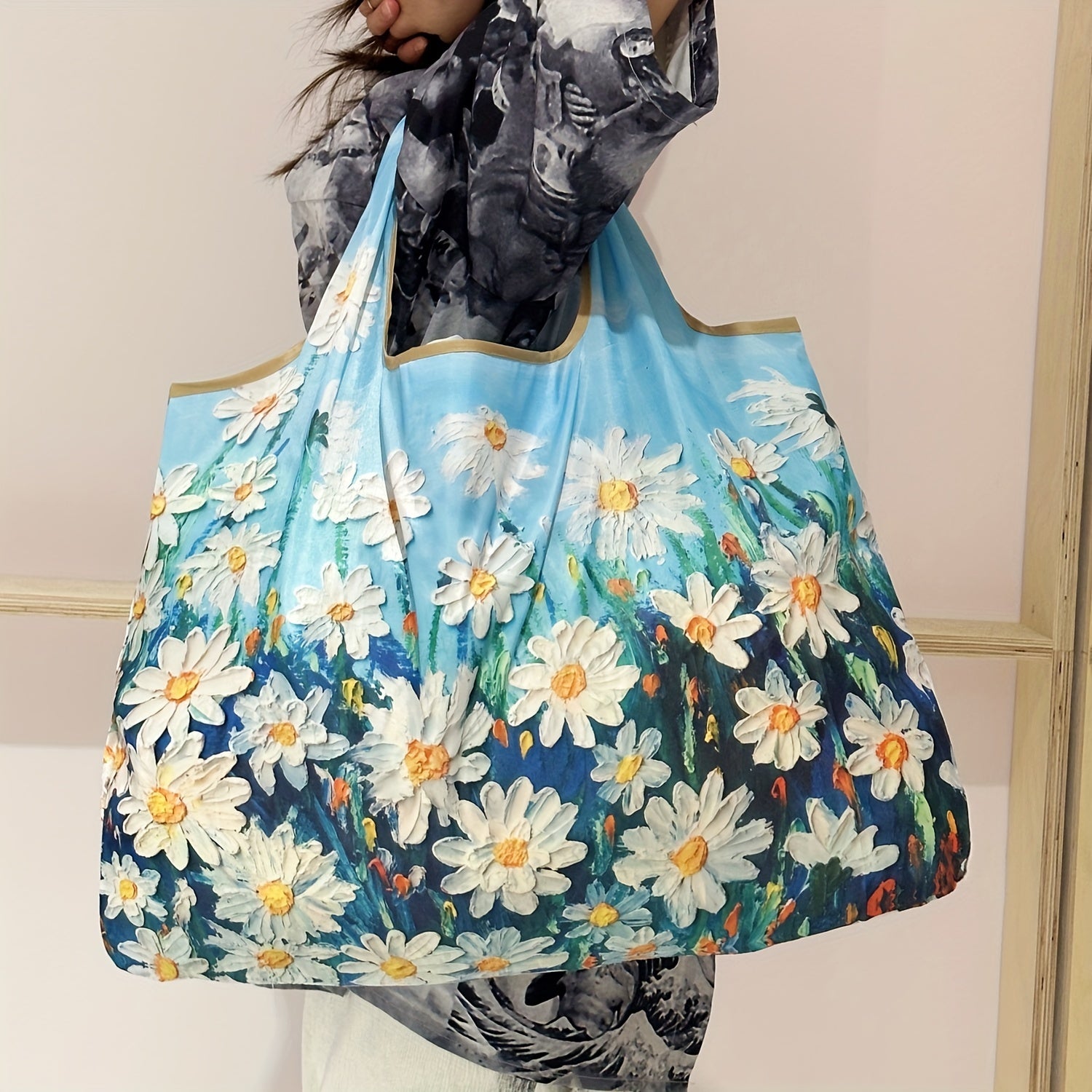 Reusable Foldable Grocery Tote Bag with Flower Oil Painting Pattern and Machine Washable