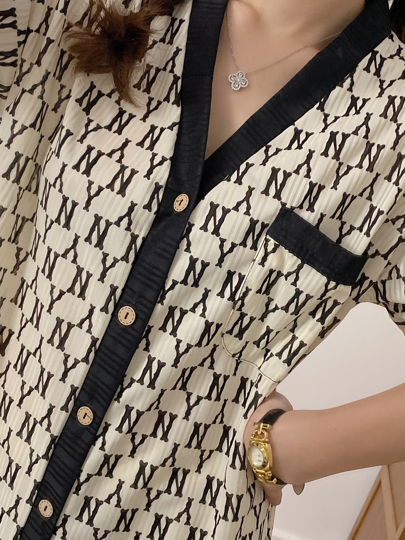 Women's Ribbed Pajama Robe with Letter Print and Colorblock Short Sleeves