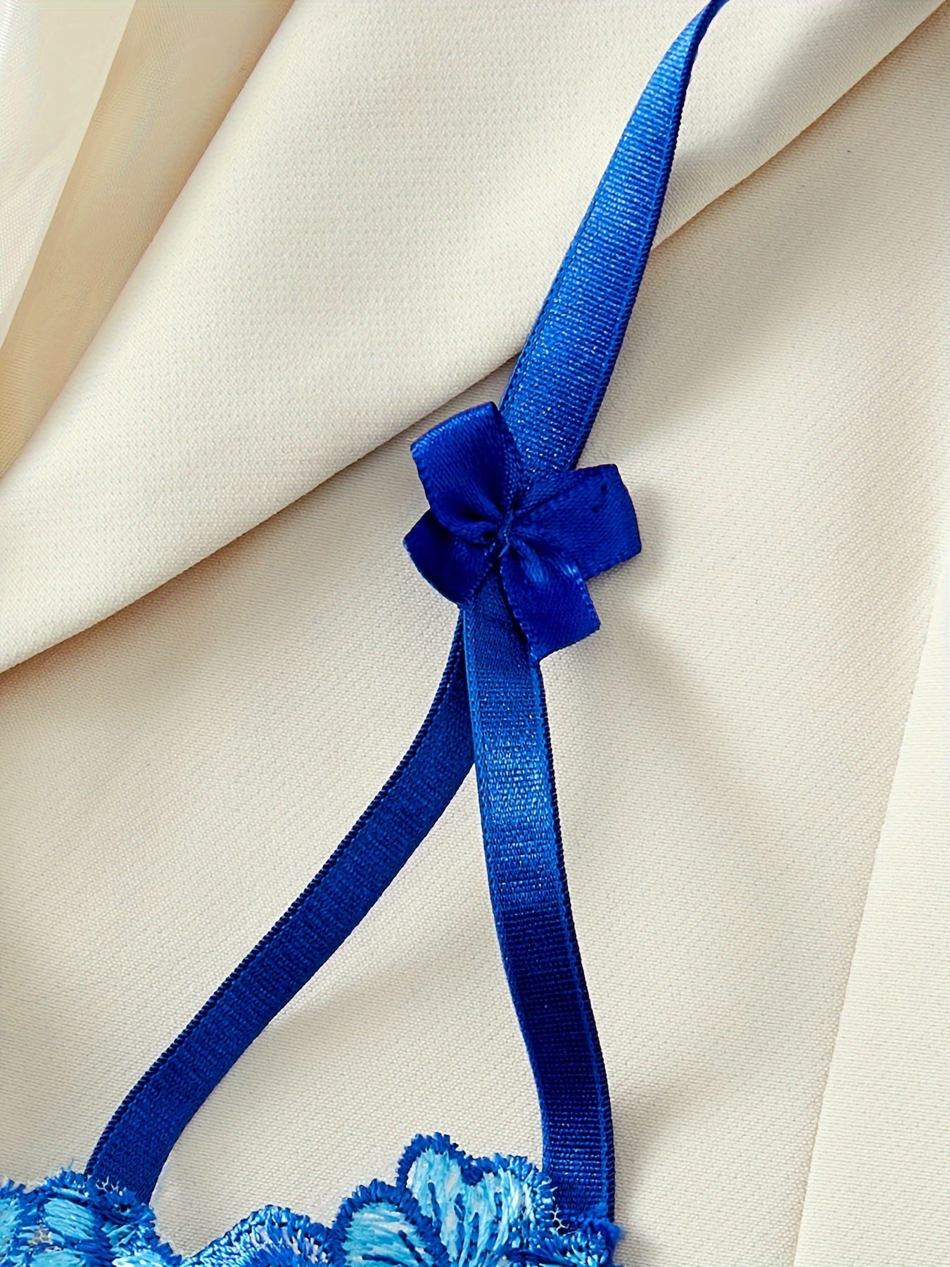 Women's Blue Floral Embroidered Lingerie Set with Sheer Mesh and Bow Details