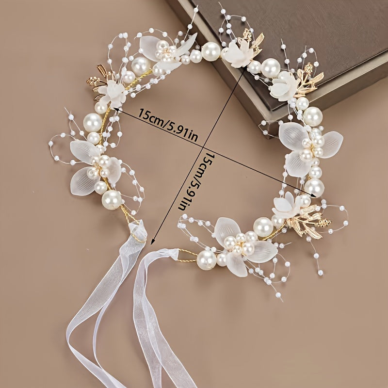 Romantic Bridal Headpiece with Faux Pearls Floral Wreath Ribbon Tie