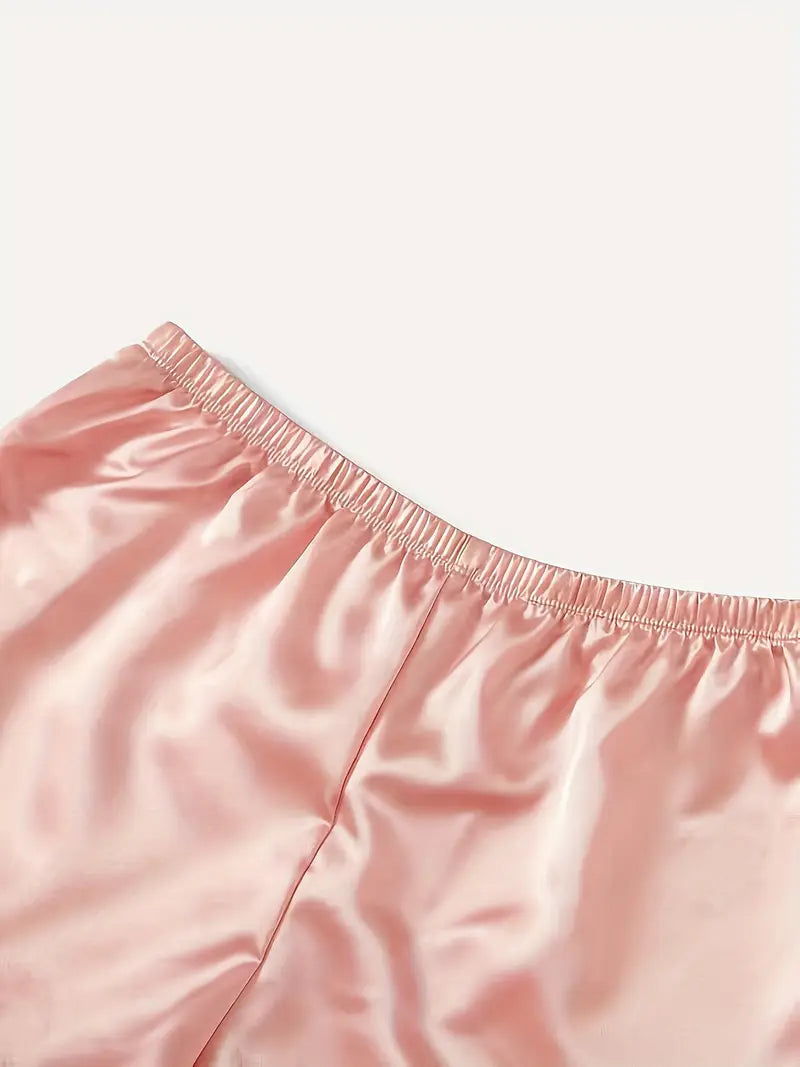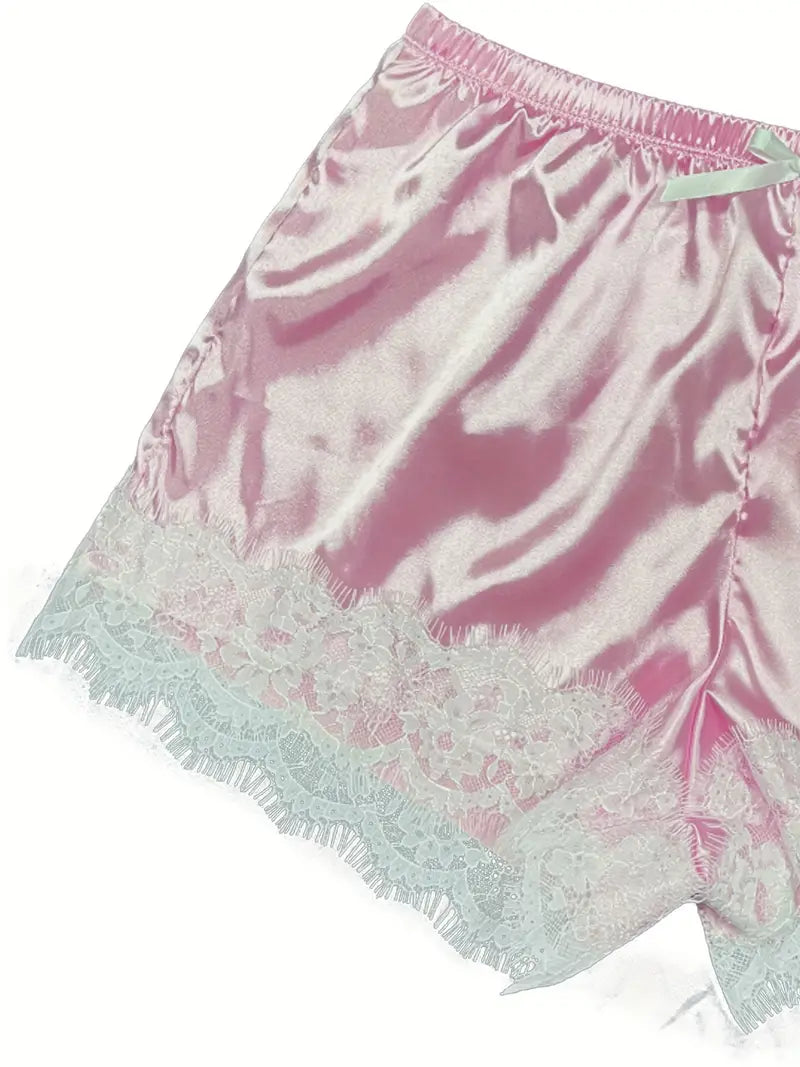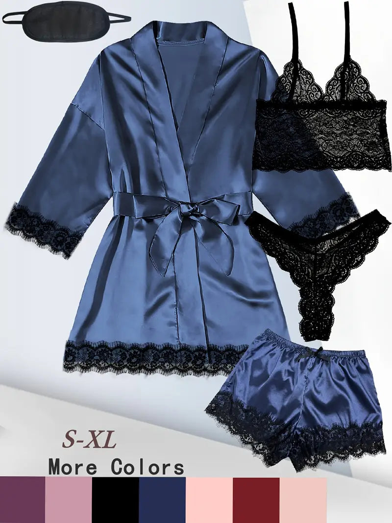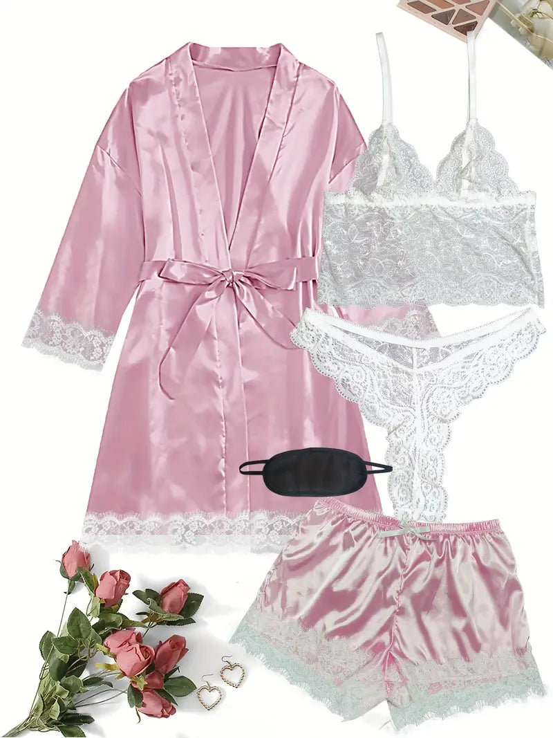 Women's Satin Lounge Set with Lace Robe Cami Bra Thongs and Shorts