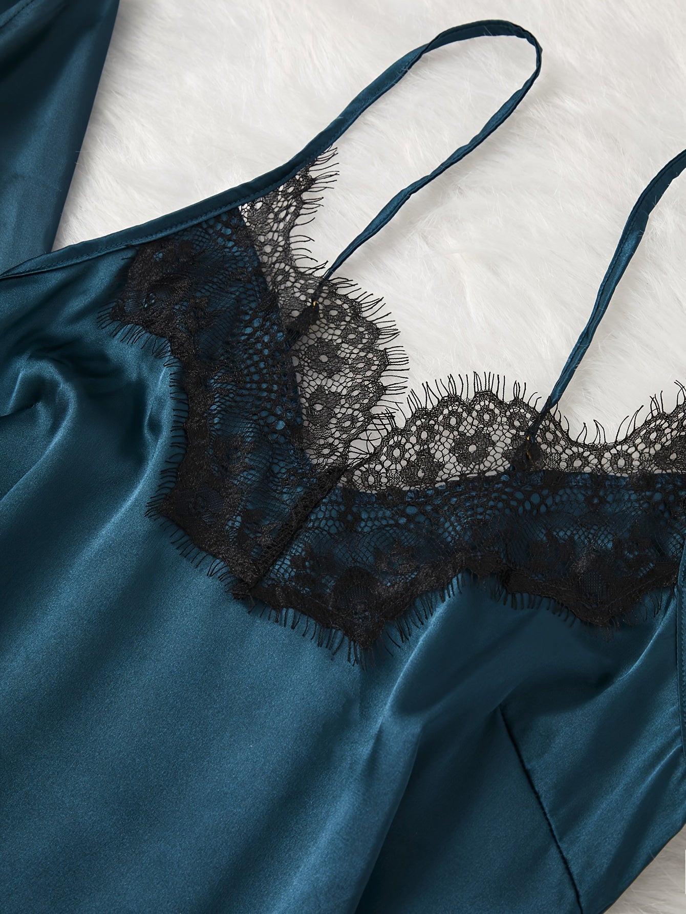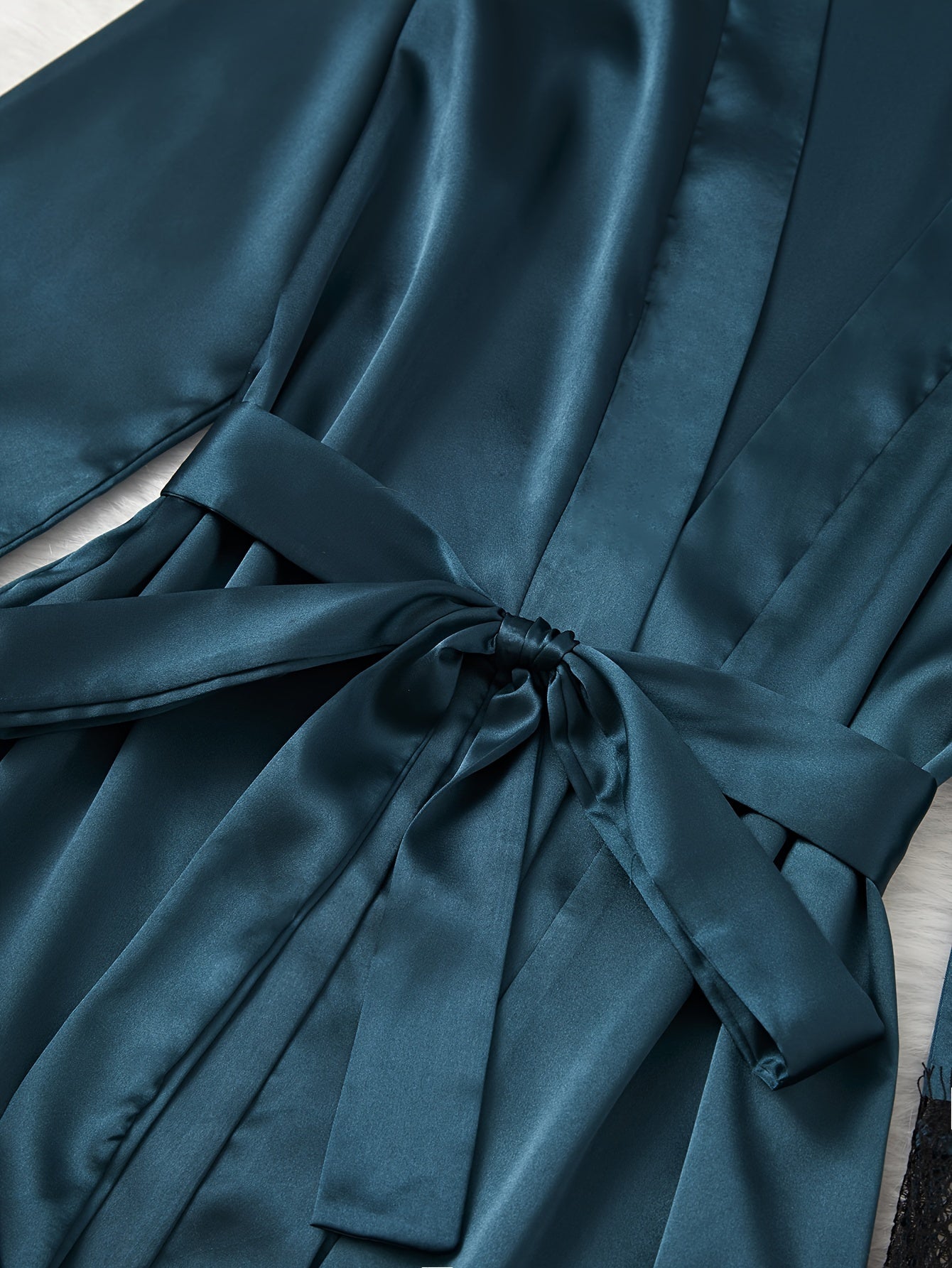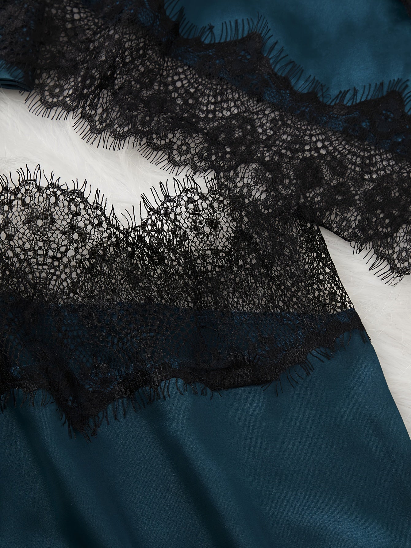 Color Contrast Lace Pajama Set for Women Satin Long Sleeve Fall Winter Elegant Micro Elasticity