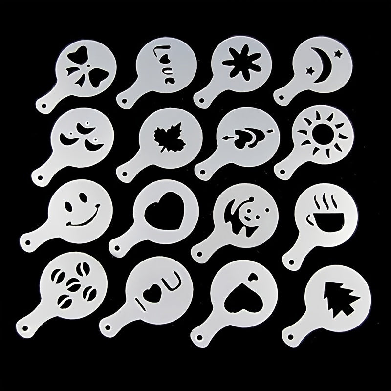 Set of 16 Plastic Coffee Stencils for Latte Art, Cappuccino Decor, Cake DIY