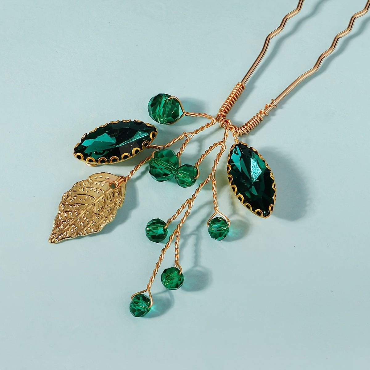 Set of 3 Green Leaf Rhinestone Hairpins for Bridal Hair Accessories Hanfu Style