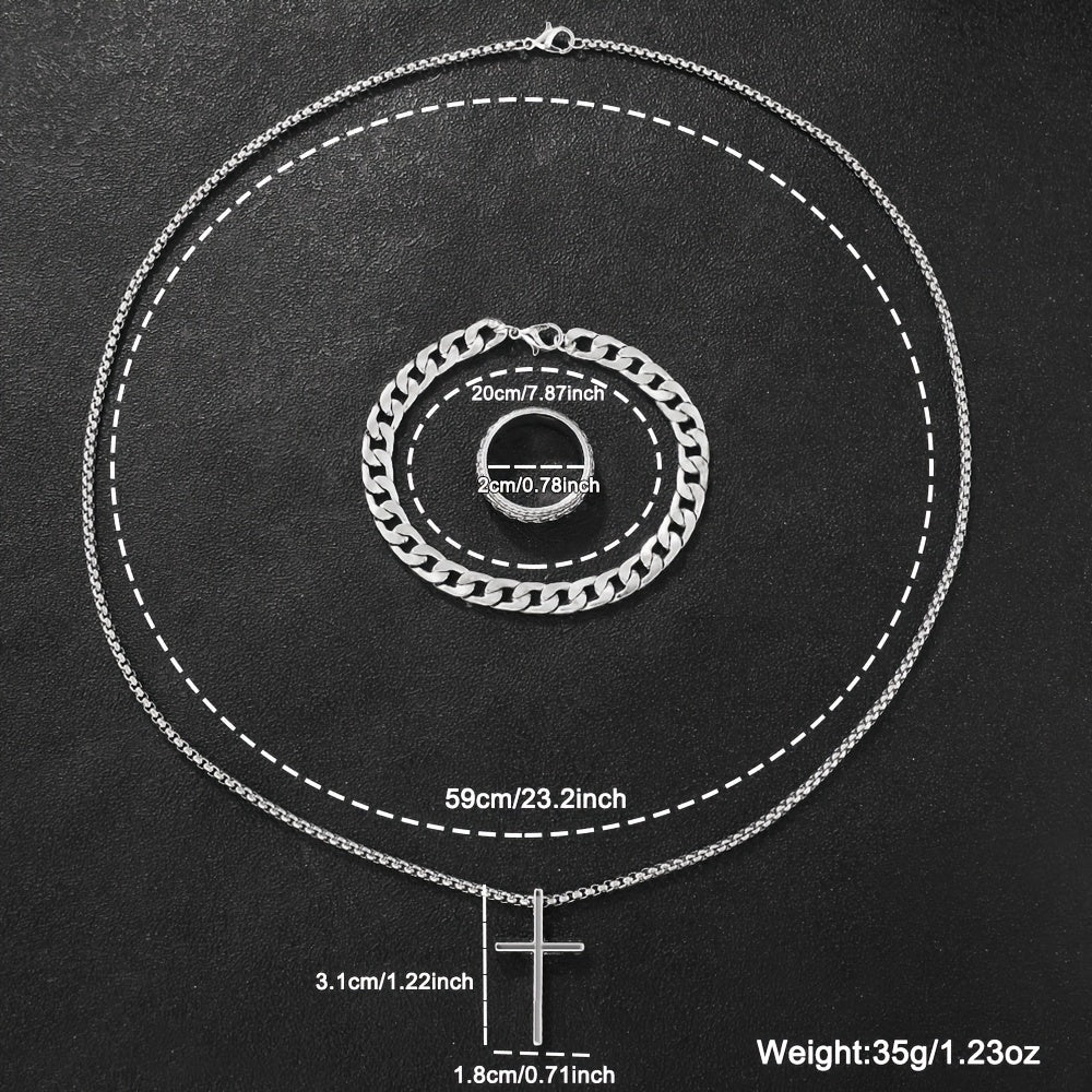 Men's Casual Watch and Jewelry Set with Silver Quartz Watch Cross Pendant Necklace Ring Bracelet