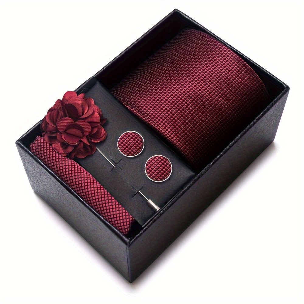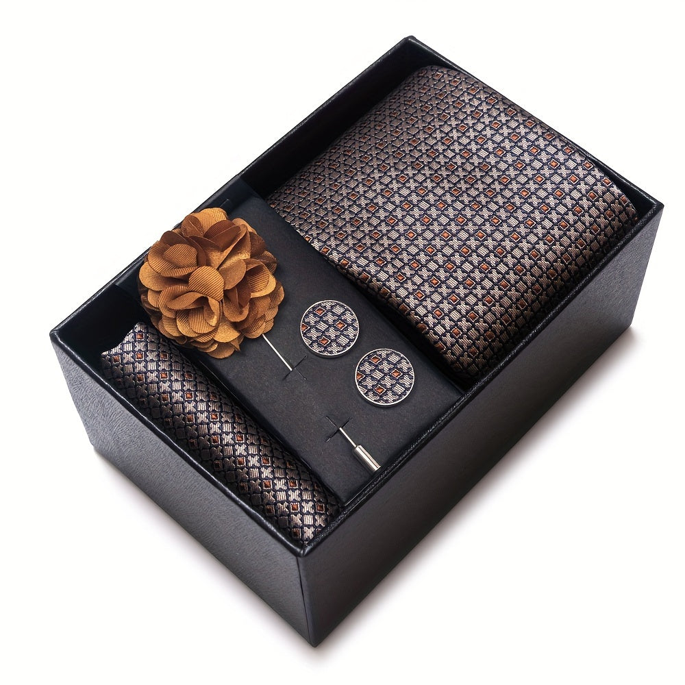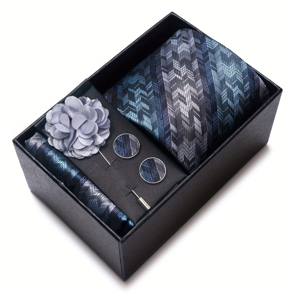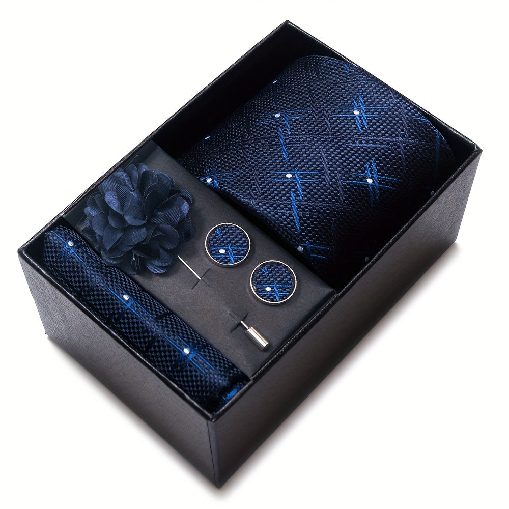 Set of 5 Men's Accessories Dark Blue Striped Necktie Hanky Cufflinks Brooch for Wedding or Business