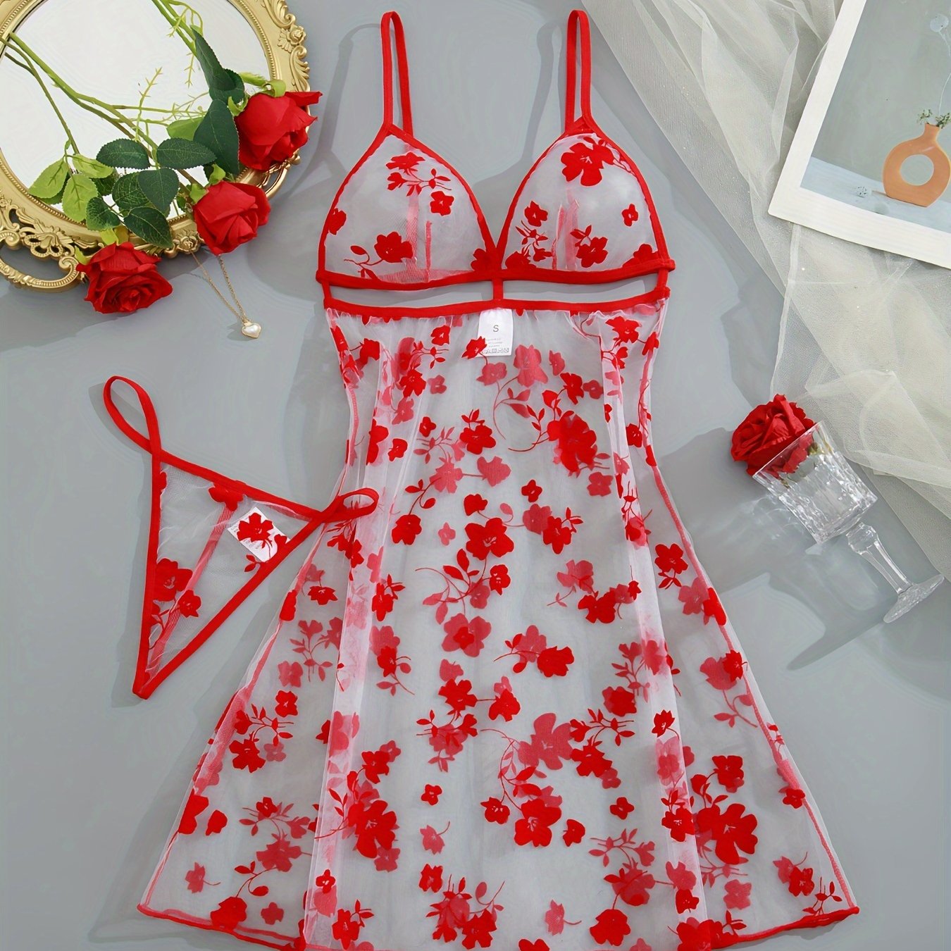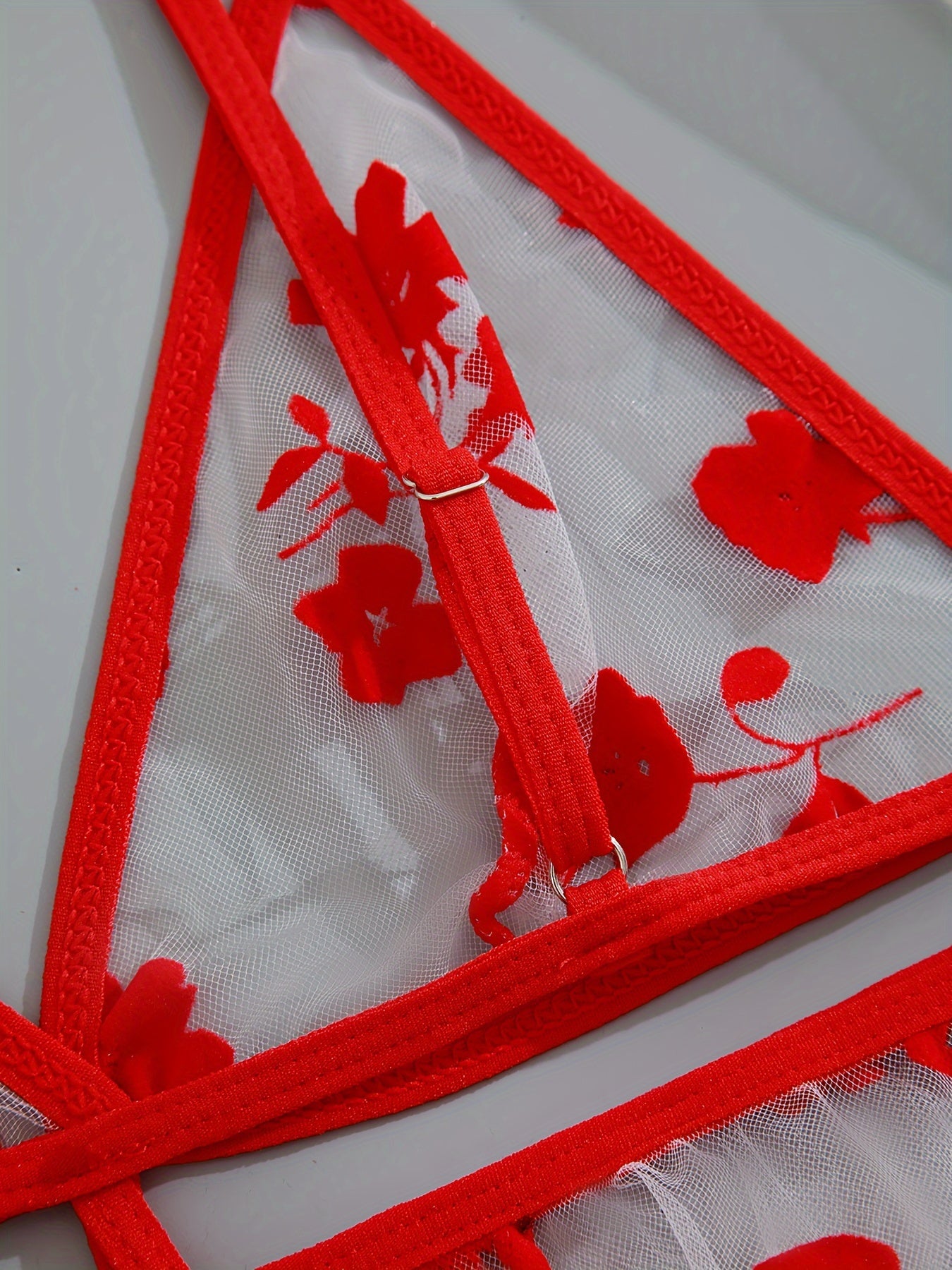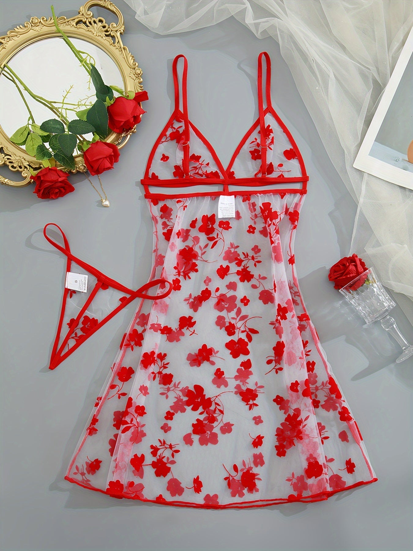 Black Floral Print Sheer Bodysuit with Thong Panties Lingerie