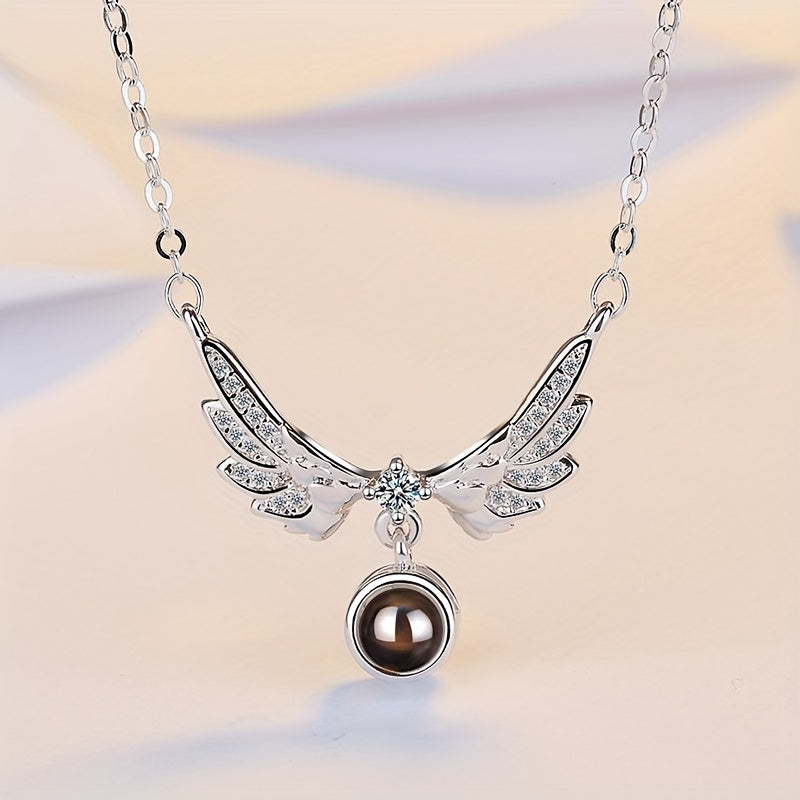 Silver-Plated Angel Wings Pendant Necklace with Cubic Zirconia Heart Charm Vintage Boho Jewelry