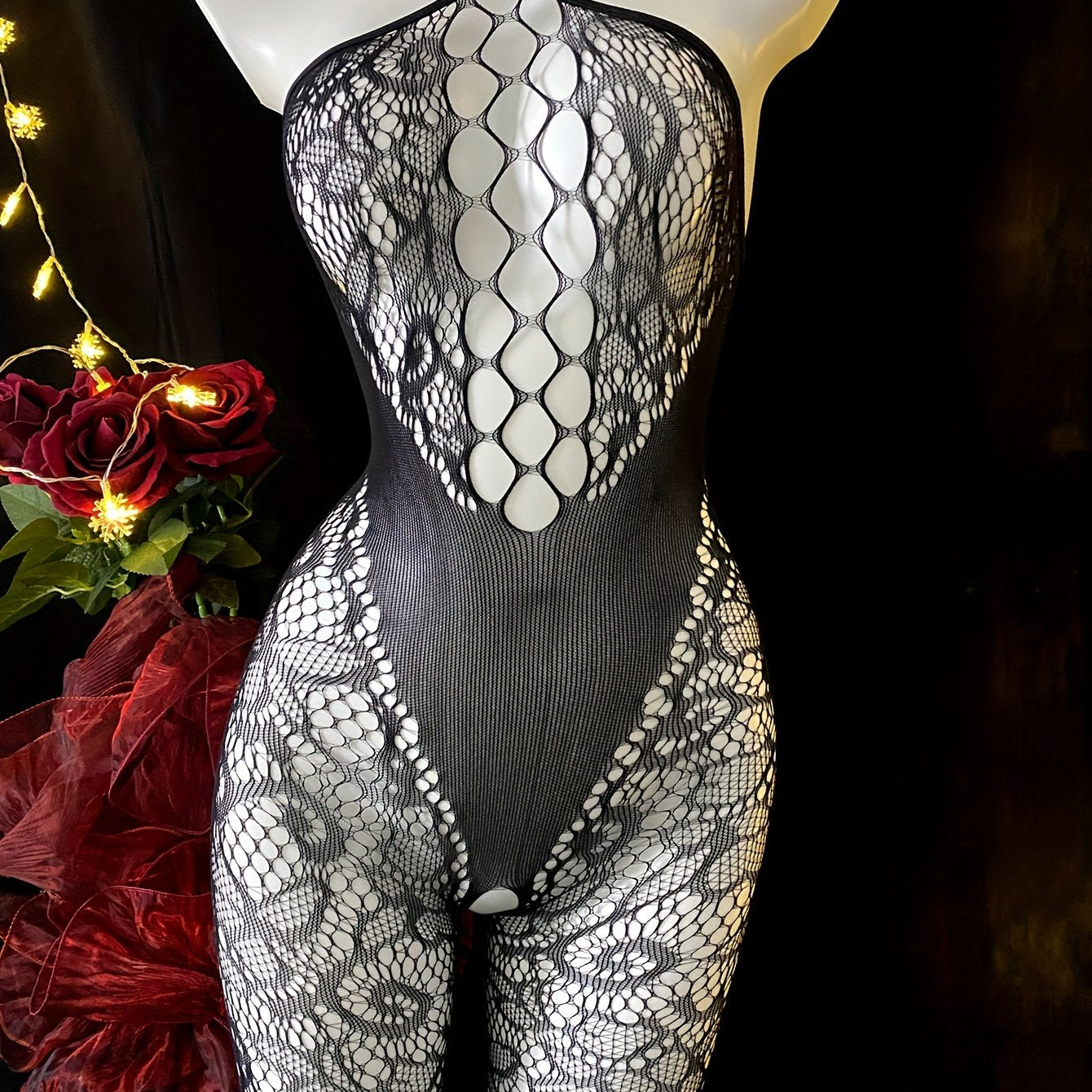 Women's Sleeveless Lace Bodysuit with Fishnet Detail Sheer Nylon Elastane