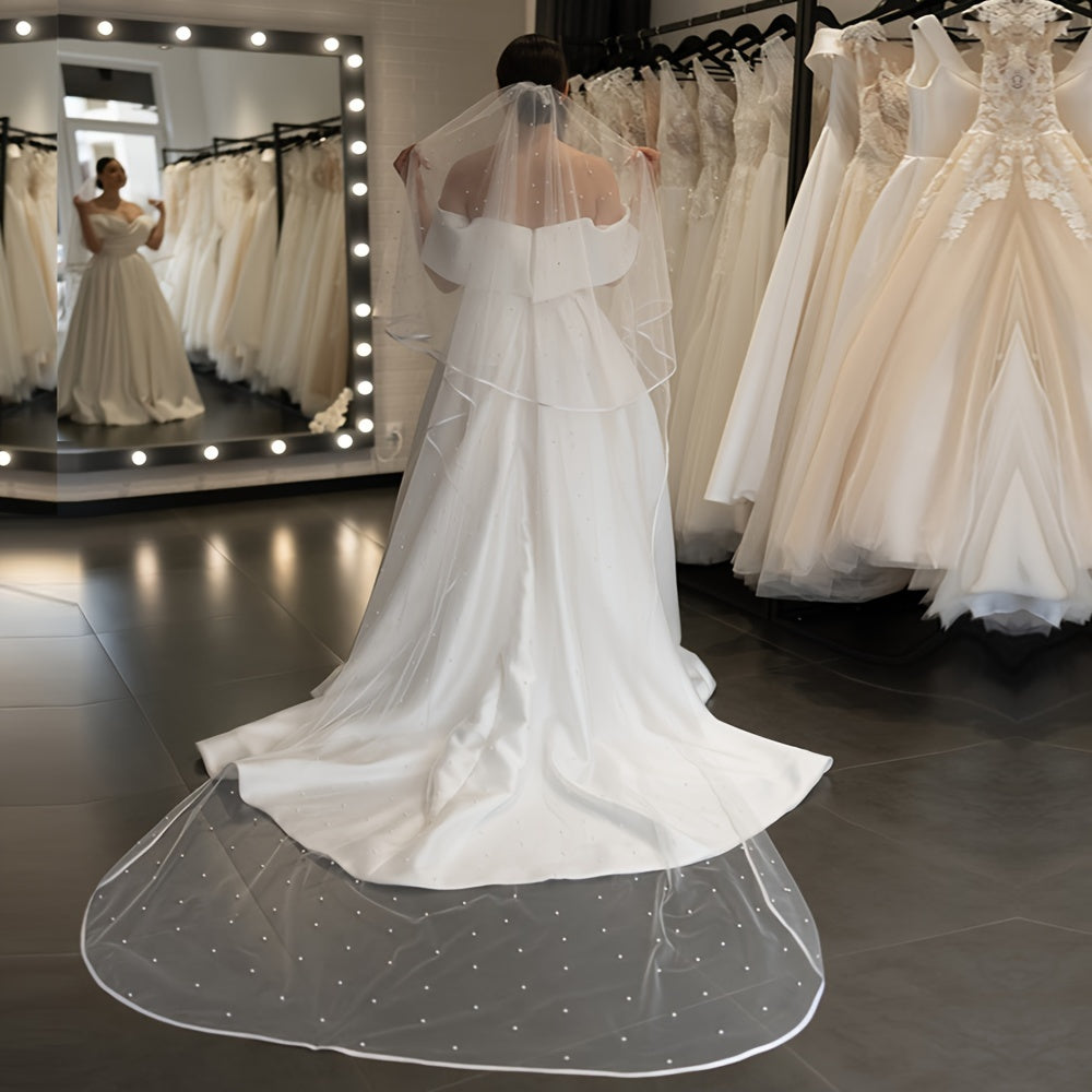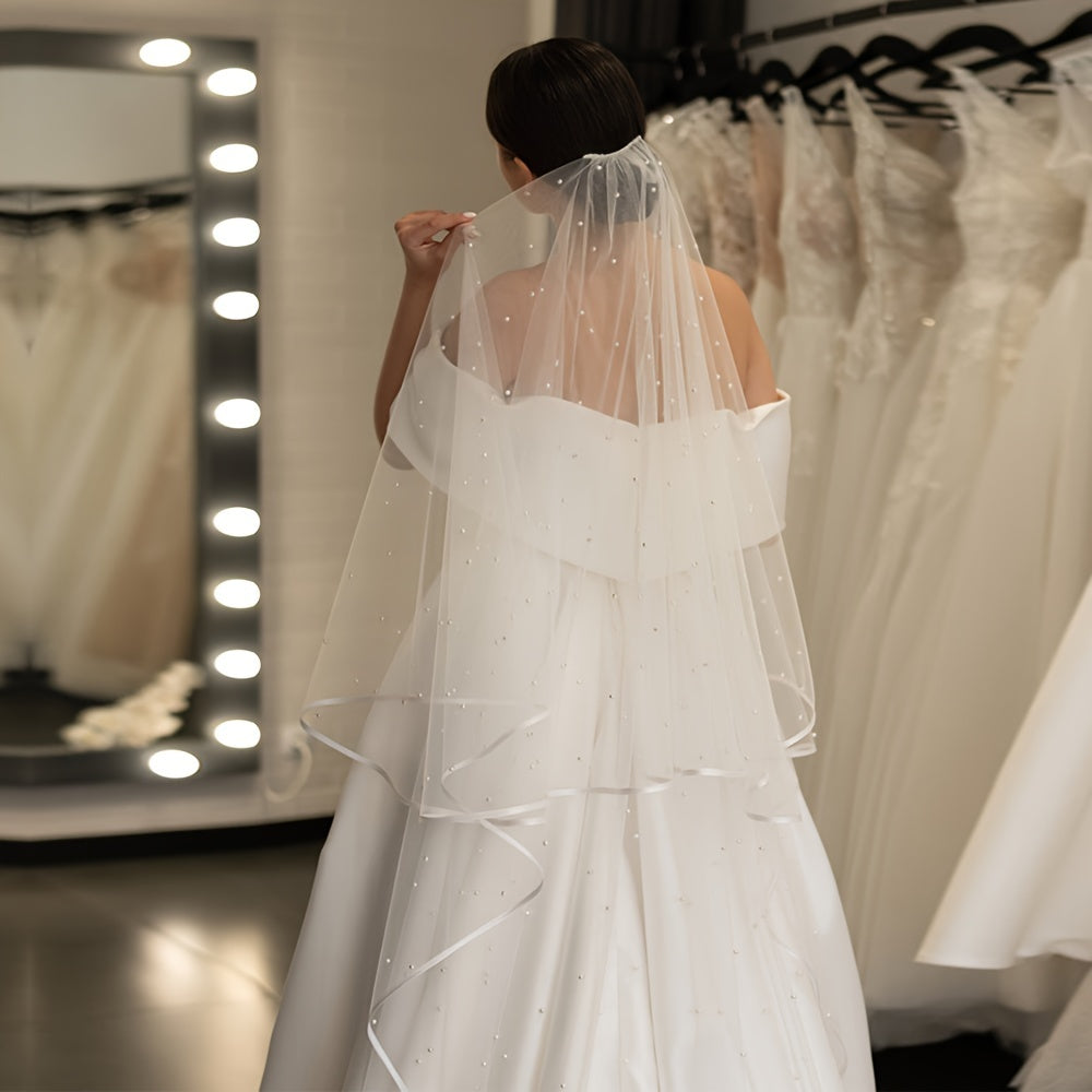 Double Pearl Veil for Brides with 2.5 Meters Length Church Ribbon Hem Hair Comb