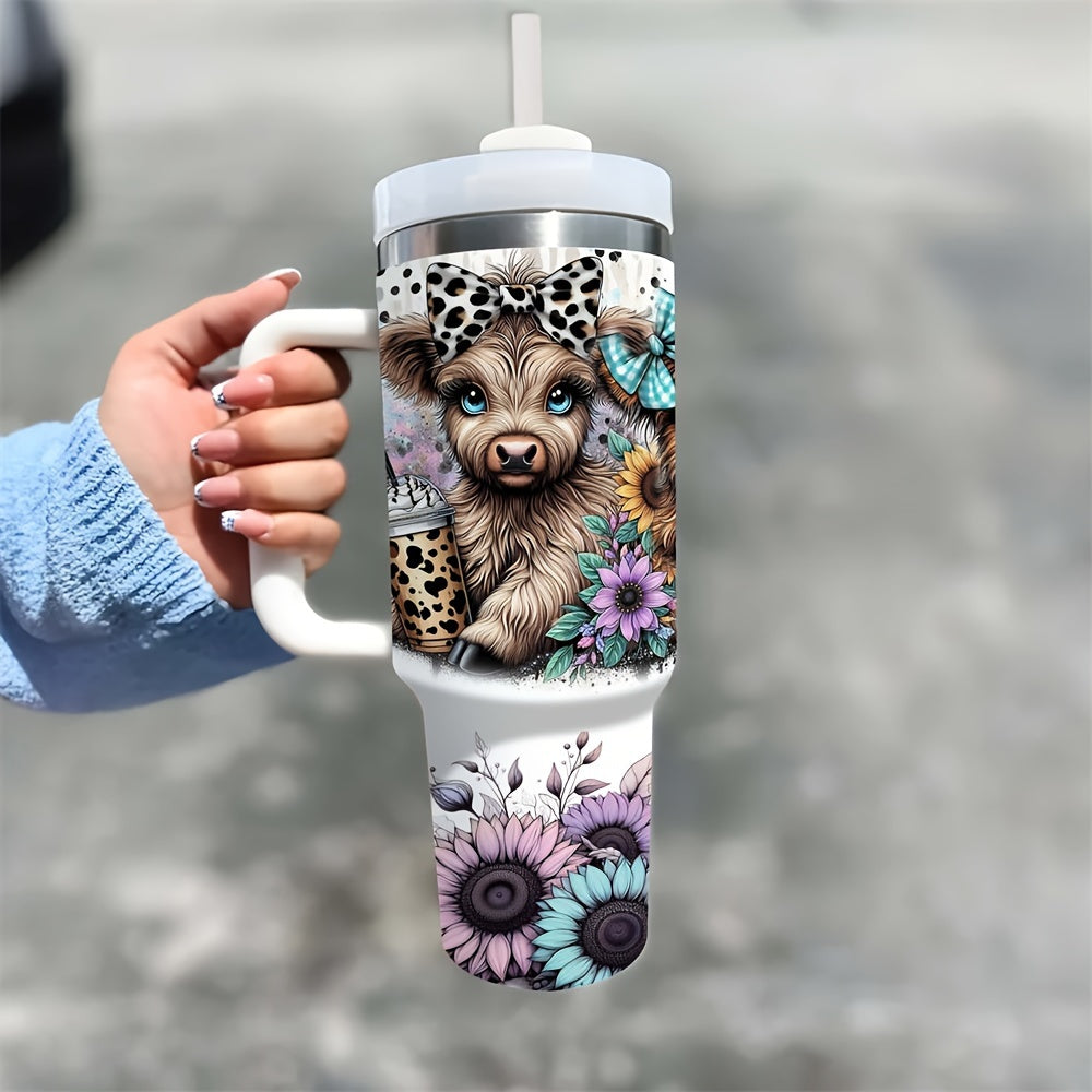 Stainless Steel Travel Mug with Handle and Straw Highland Cow Sunflower Design