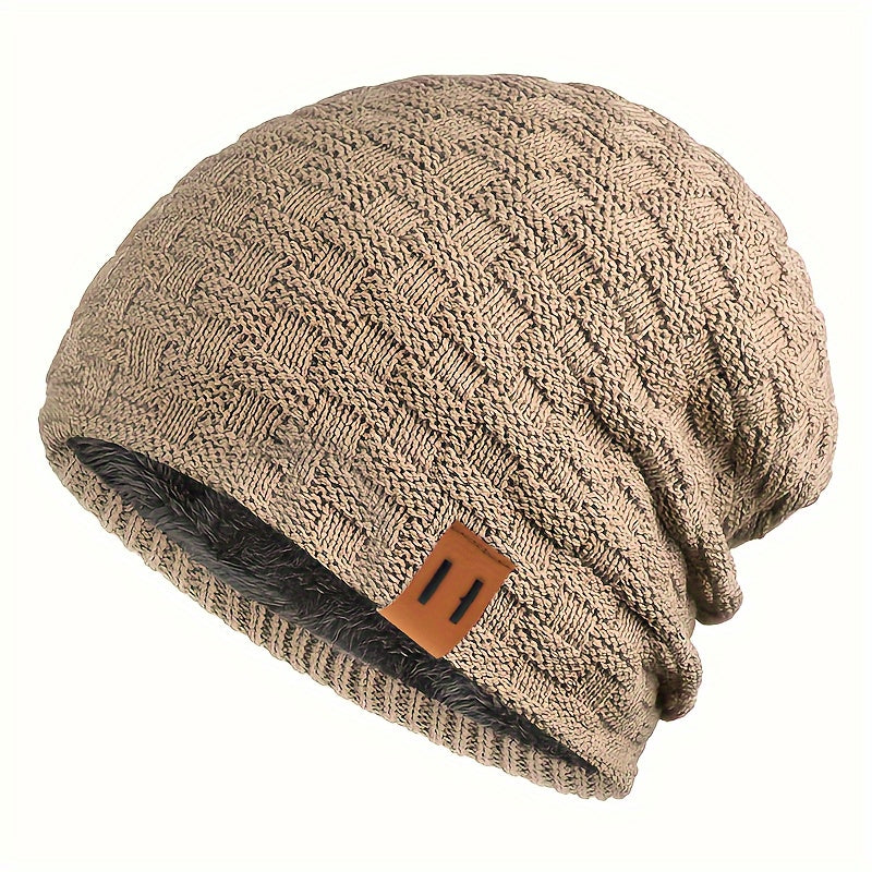 Men's Knit Beanie Winter Hat Faux Leather Patch Warm Windproof for Cycling Hiking