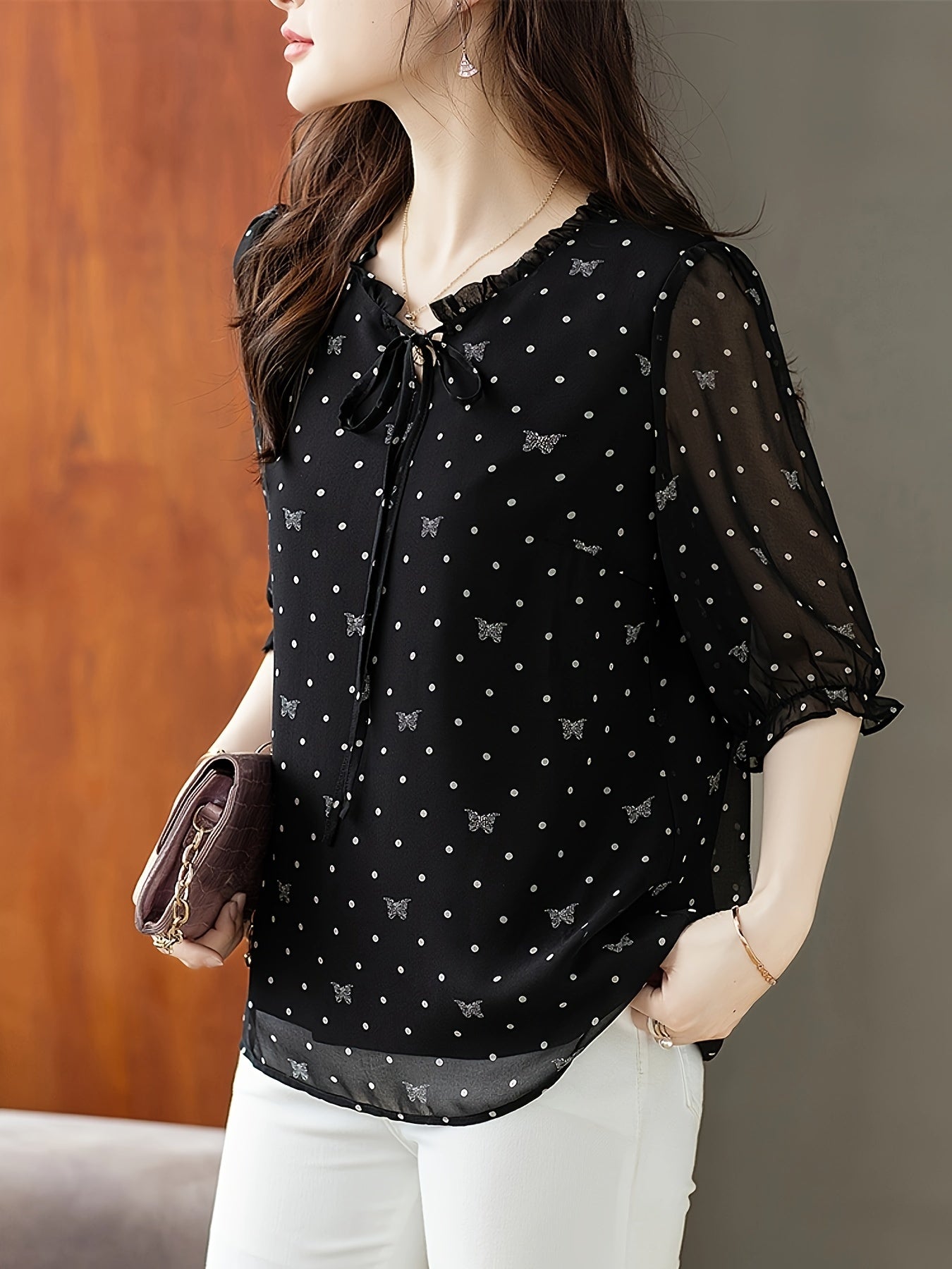 Black Floral Chiffon Blouse with Bow Tie Neck Sheer Sleeves Summer 2024