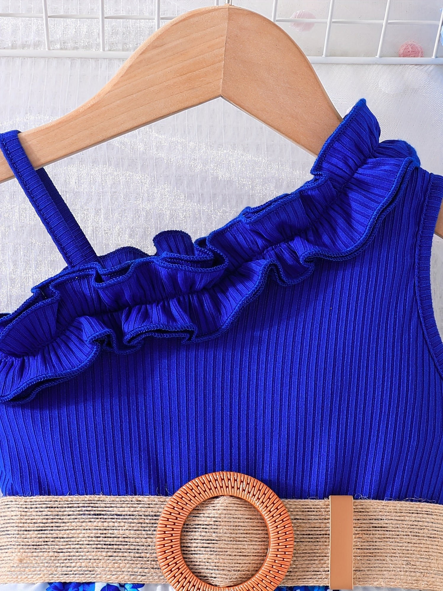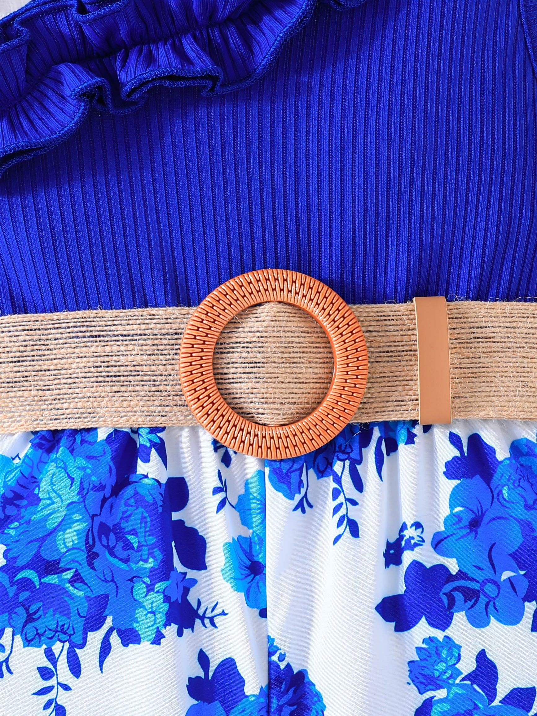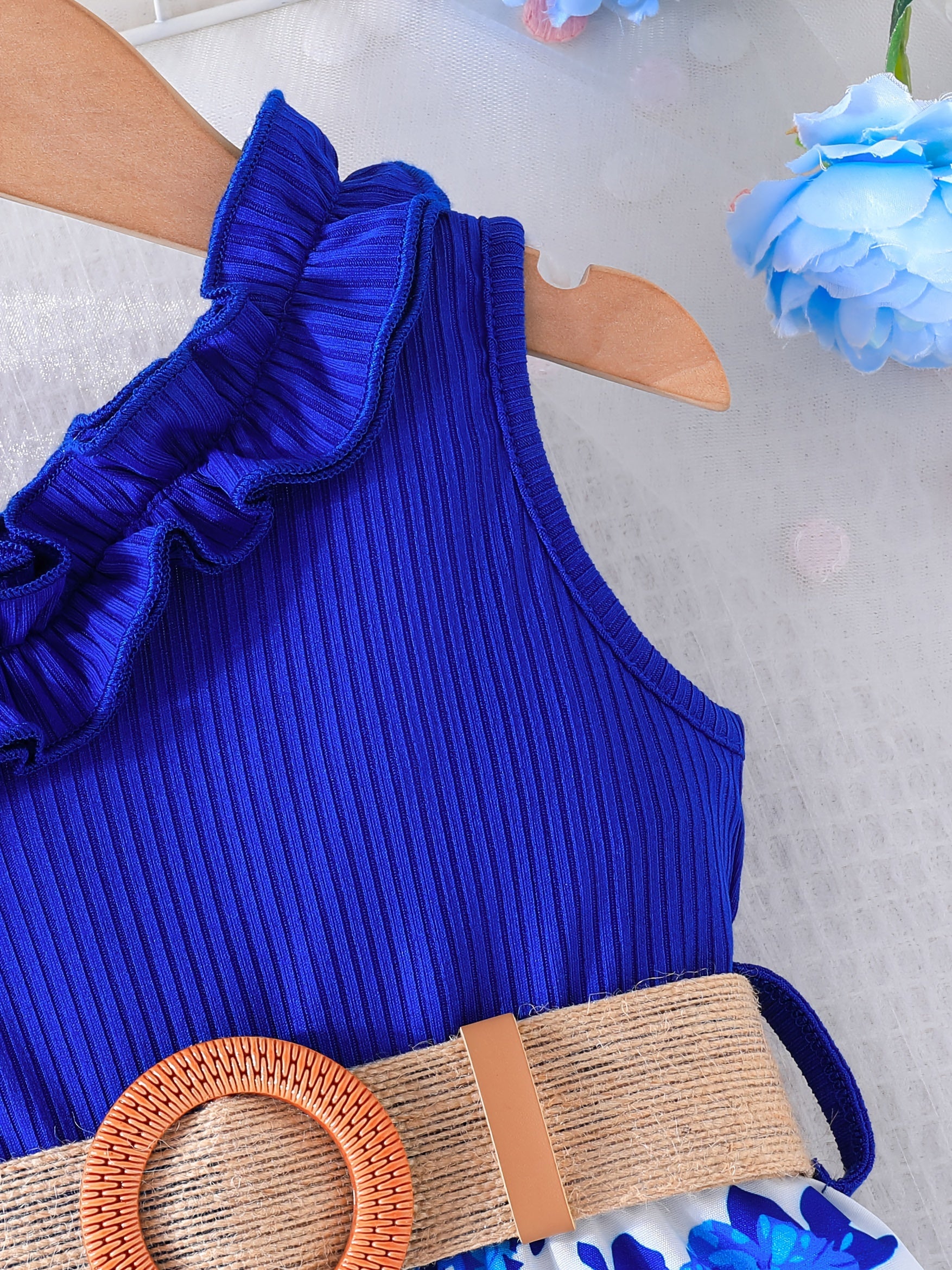 Girls Floral Print Sleeveless Romper with Belt for Spring Summer Outdoor Wear