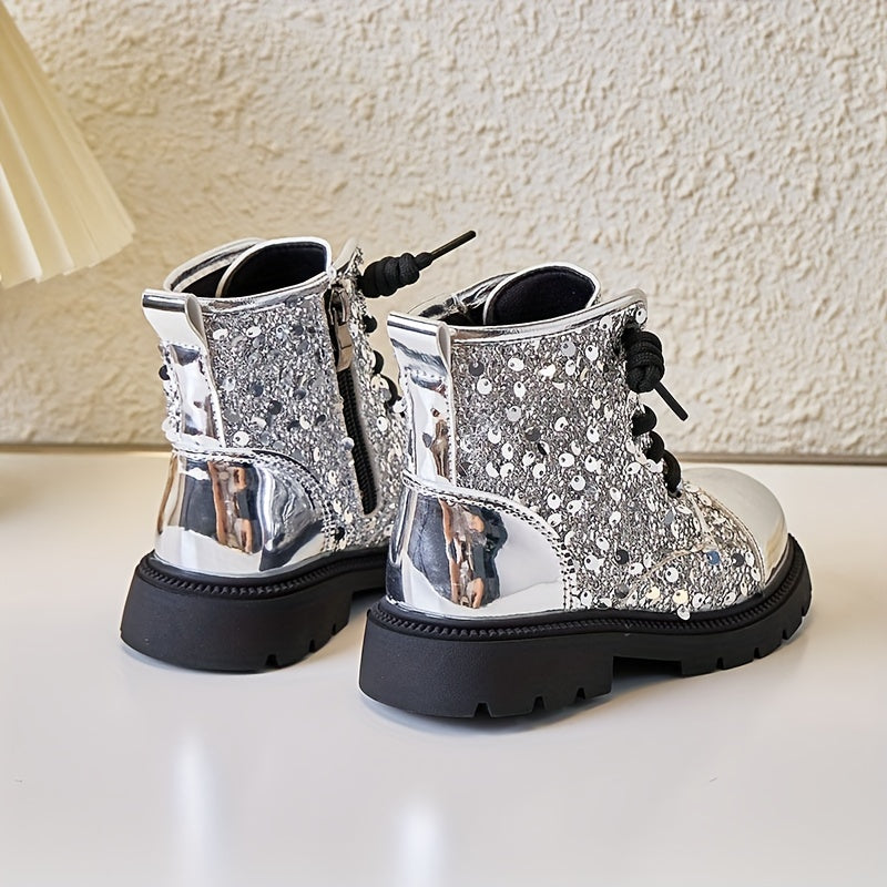 Girls Glitter Ankle Boots Fall Winter Zipper Low Top PU Rubber Sole